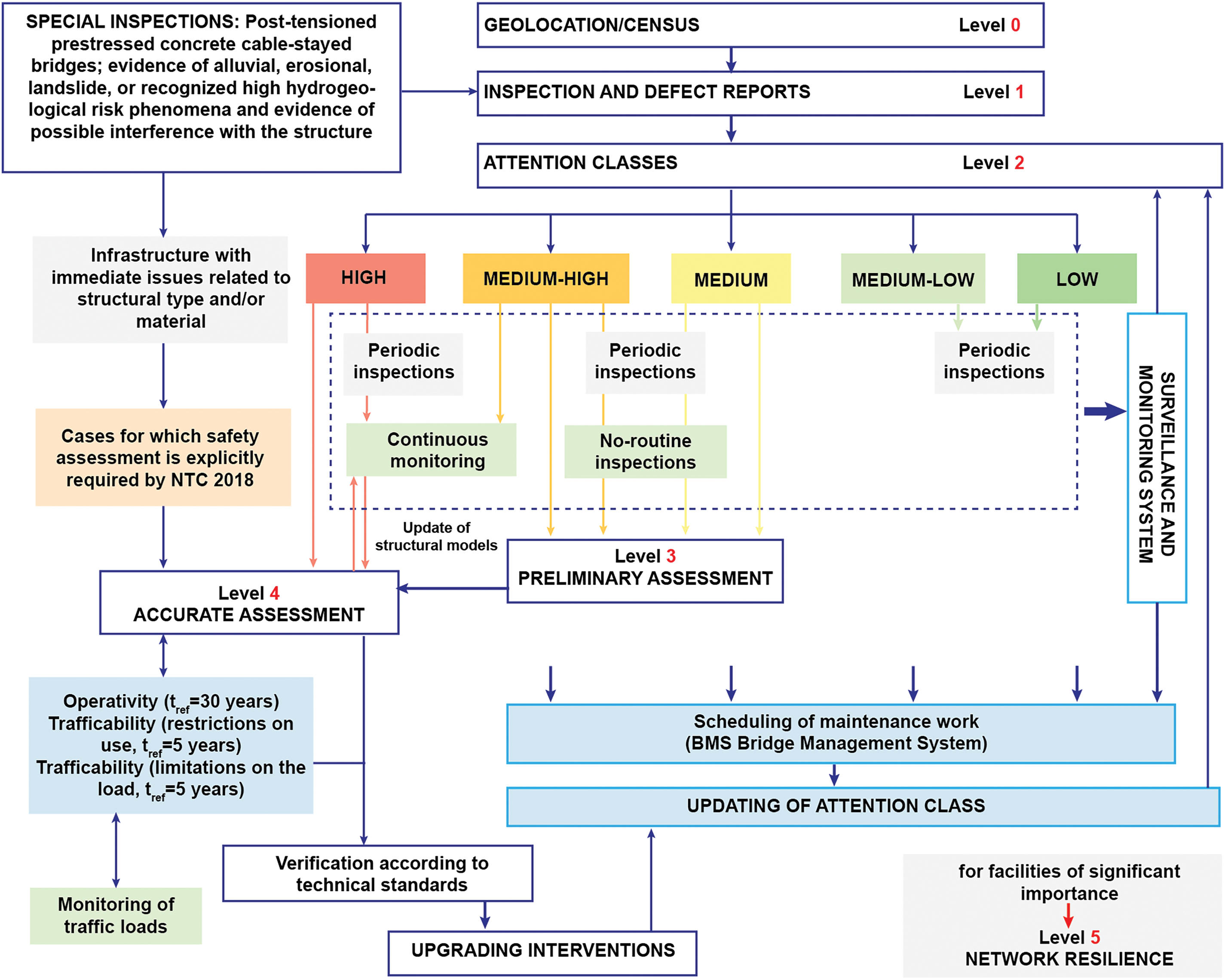 Infrastructure categorized in classes from “medium” to “high” is subjected to Levels 3 and 4, which entail a more detailed evaluation in accordance with the Italian building code,12 and in select cases, to a Level 5, applied exclusively to a specific type of infrastructure.