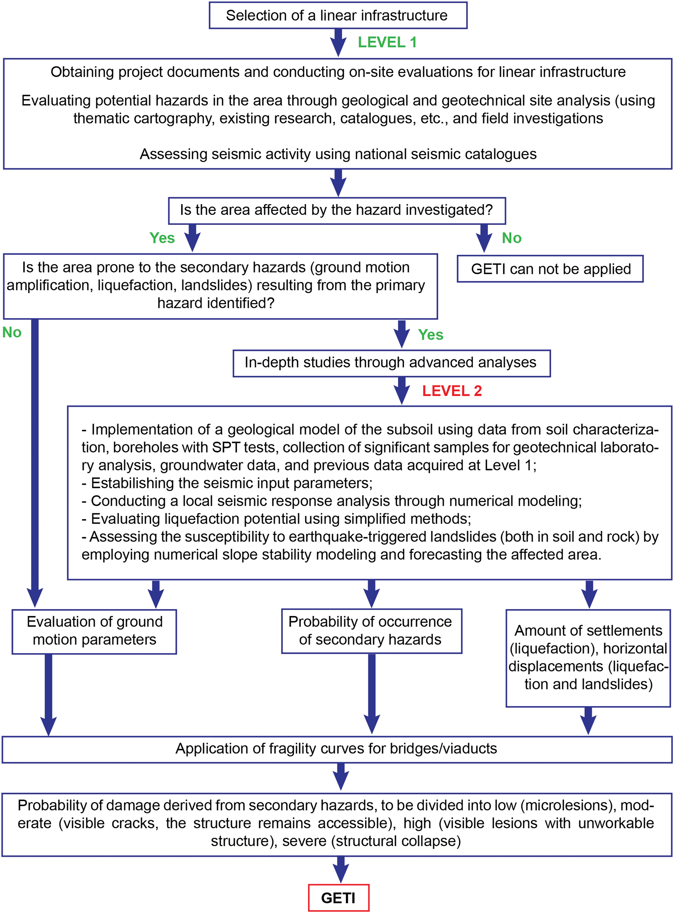 In short, the GETI index is proposed as an easy-to-use instrument for risk assessment from a multi-hazard perspective, applied to linear infrastructure such as road bridges and viaducts. The index is conceptualized as a two-level analysis process, using geotechnical parameters to assess the risk through fragility curves. The output data are the probabilities of low, moderate, high, and severe damage, given the earthquake and its secondary effects.