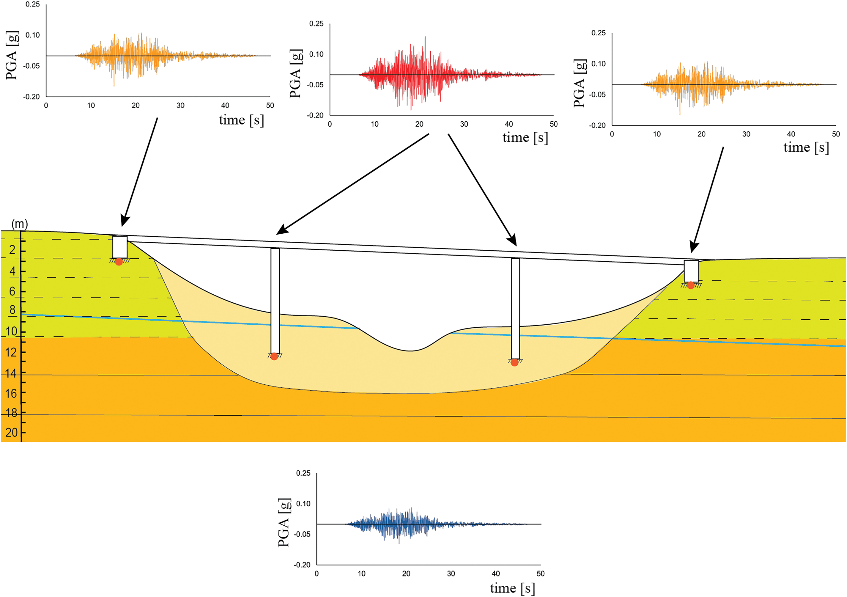 Figure 4. Sketch of a 2D site response analysis of a bridge crossing a valley filled by alluvial soils, showing typical results of ground motion at the foundations level. The blue accelerogram represents the seismic input at bedrock for an assigned seismic scenario (defined by a certain probability of occurrence/return period), while the red and orange accelerograms represent the ground motion at the foundations level. Yellow and orange polygons represent stratified consolidated deposits, while light yellow depicts loose deposits