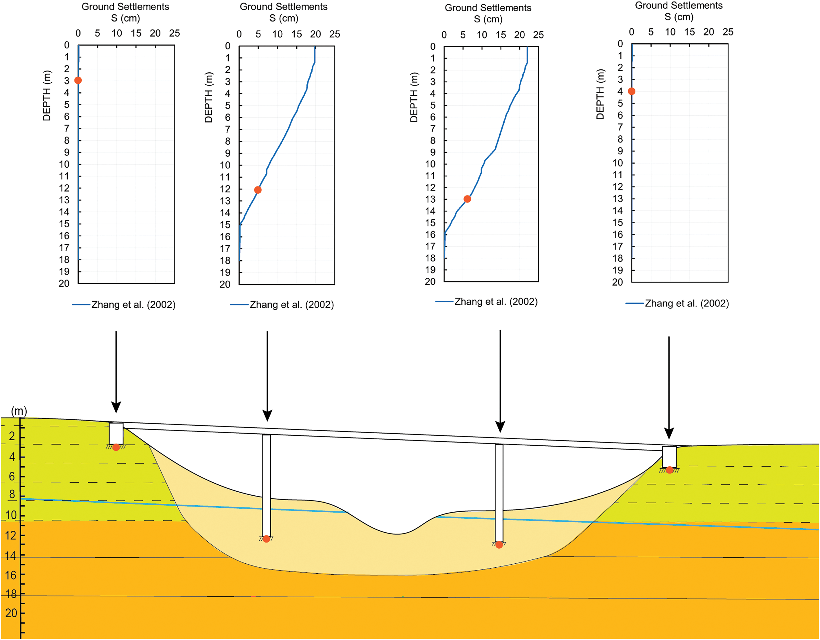 Figure 5. Sketch of a bridge crossing a valley filled by alluvial soils, showing typical results of liquefaction analyses in terms of permanent settlements at foundation levels. Yellow and orange polygons represent stratified consolidated deposits, while light yellow depicts loose deposits. The cumulative ground settlements according to Zhang et al.29 are plotted; orange circles depict the foundations level; the blue line represents the ground water table