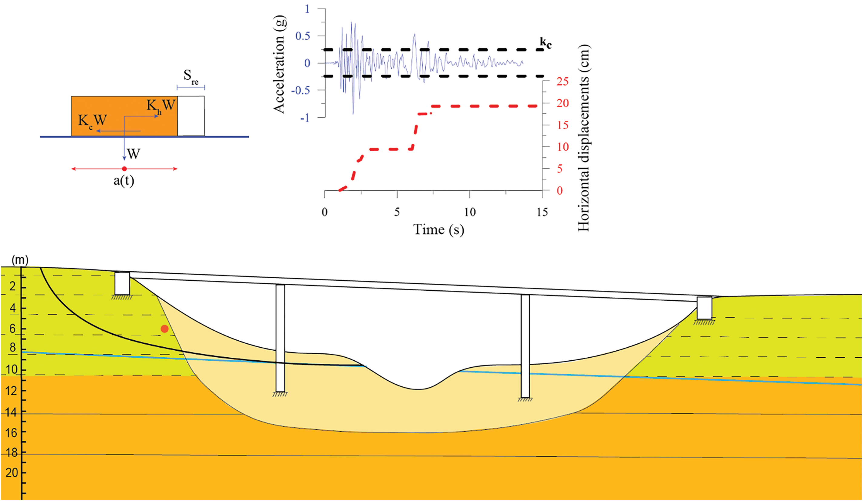 Figure 6. Sketch of a bridge crossing a valley filled by alluvial soils showing typical results of Newmark slope analyses in terms of permanent displacements. The accelerogram a(t) is computed at the center of mass (orange point) of the potential landslide. kc is the critical seismic coefficient (dashed blue line), W is the weight of the block corresponding to the unstable mass, and Sre is the horizontal permanent displacement of the unstable mass at the end of the shaking. Yellow and orange polygons represent stratified consolidated deposits, while light yellow depicts loose deposits and the black curve identifies the detachment surface