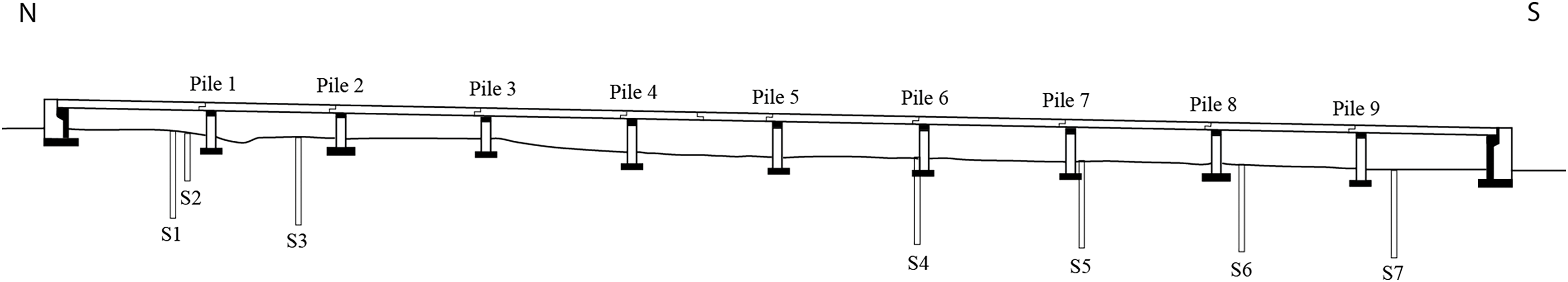 In this regard, and considering the position of the piles in relation to the slope, the stratigraphy of boreholes S4, S5, S6, and S7, corresponding to piles from 6 to 9, and to the southern abutment, was extended to piles from 3 to 5. The stratigraphy of boreholes S1, S2 and S3 was considered for the abutment in the northern part of the structure, as well as for the first two piles (Fig. 8). The Vs profiles of the models adopted in the analyses are shown in Fig. 9a. The effect of micropile improvement in the upper 15 m of subsoil was not considered in the analysis. As a result, seven PGA profiles were obtained (Fig. 9b).