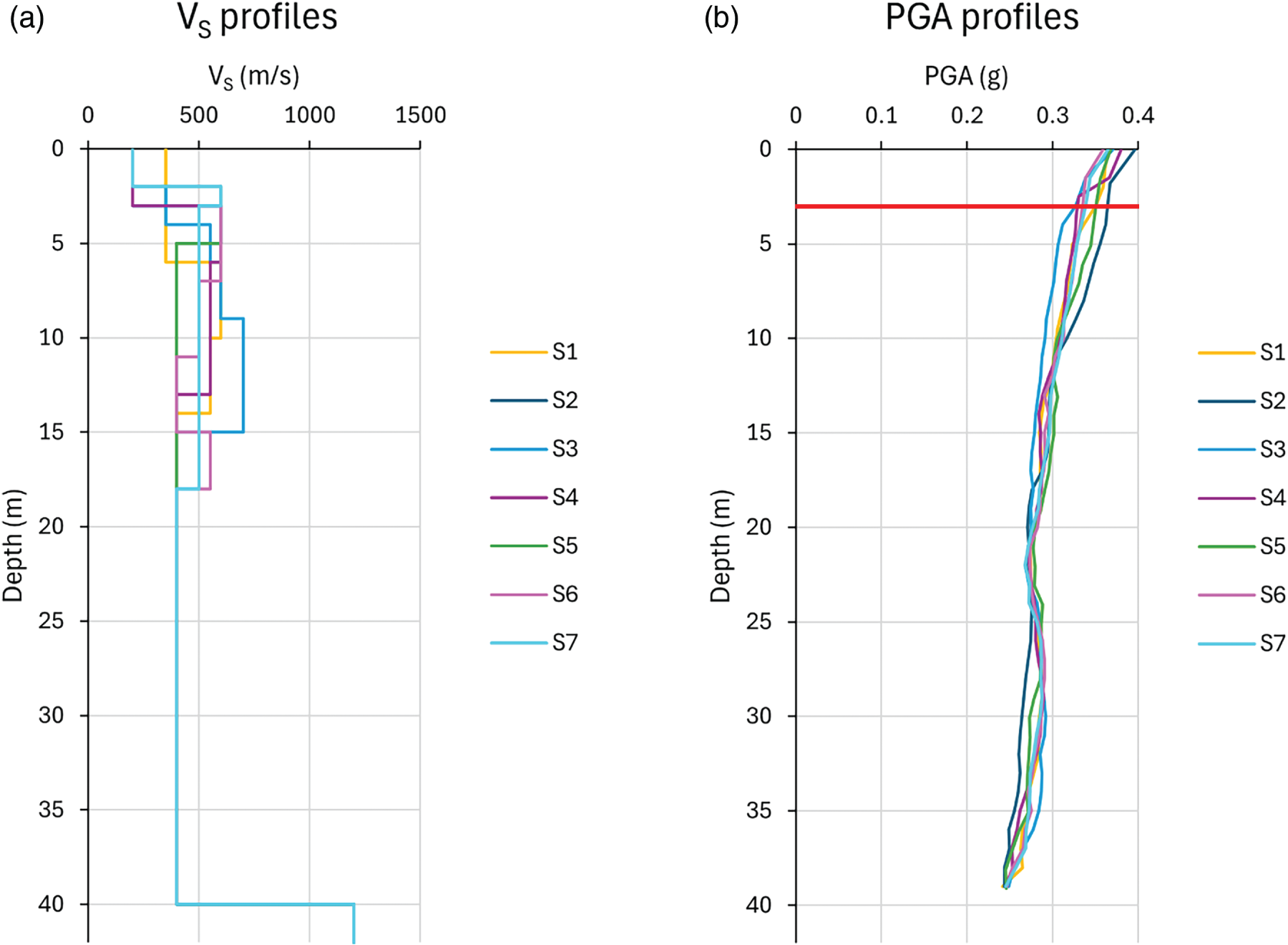 Figure 9. (a) VS profiles deducted from microzonation studies and adopted for site response analyses; (b) PGA profiles, considering boreholes S1, S2, S3, S4, S5, S6, and S7, obtained through the site response analysis using DEEPSOIL code version 7.1.49 The red line represents the foundation level