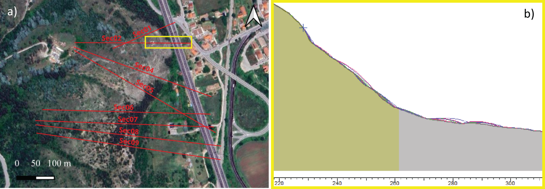 Figure 10. (a) Satellite (Google Earth) view of the slope near the viaduct; red lines depict the section traces, and the yellow box indicates the slope profile reported in (b). (b) Slope profile with detachment points (crosses) and trajectories (red and blue lines) of falling blocks, as simulated using the Rockfall2D code