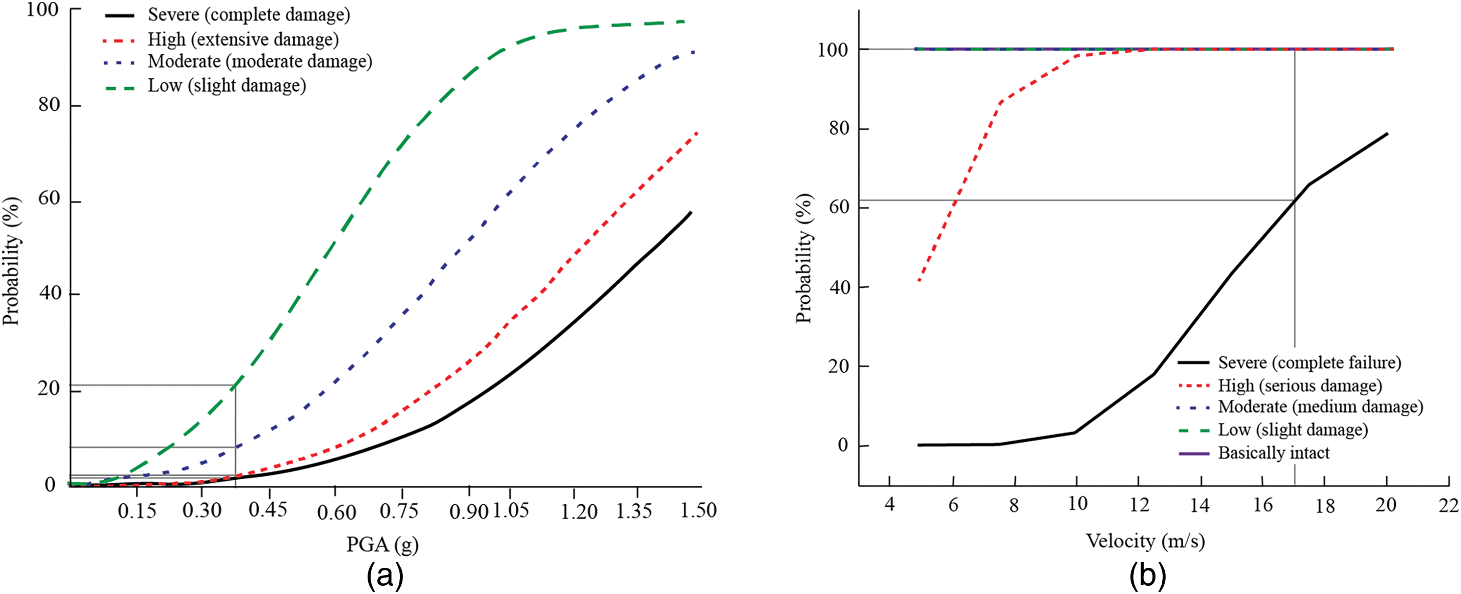 Figure 11. Fragility curves for damage on bridges derived from (a) ground shaking (modified from Brandenberg et al.40) and (b) rockfall (modified from Xie et al.44). Gray lines represent PGA and block impact velocity resulting from the analyses conducted in this study