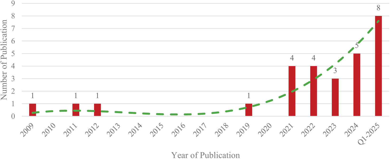 The selected articles were categorized by publication year to examine trends in publication rates. As illustrated in Fig. 2, there has been a notable rise over the past decade in the number of publications focused on AI applications during the construction phase of bridge infrastructure. The trend line in the figure indicates that research interest in this field has significantly increased, especially within the past 2 years.