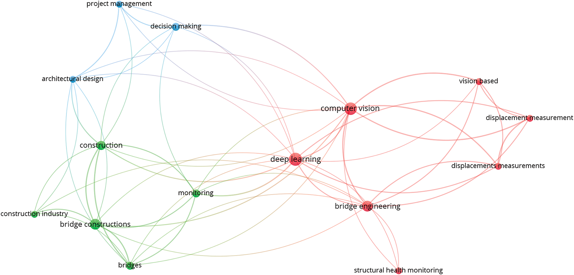 Keywords play a crucial role in highlighting the core concepts, methods, and essential aspects of a research field, providing concise descriptions of the main topics covered. To gain a thorough understanding of the research domain, a co-occurrence network of keywords was developed, setting the minimum keyword occurrence threshold to “3.” Fig. 4 illustrates the resulting keyword network, comprising 15 keywords meeting this threshold. In this figure, each keyword is depicted as a node whose size reflects its frequency of occurrence. The distances between nodes represent the strength of their relationships; smaller distances indicate stronger connections, while larger gaps signify weaker associations. Additionally, keywords are grouped into color-coded clusters based on their frequent co-occurrences. For example, keywords such as “deep learning,” “computer vision,” “bridge engineering,” and “displacement measurement” frequently appear together, demonstrating their strong interrelatedness.