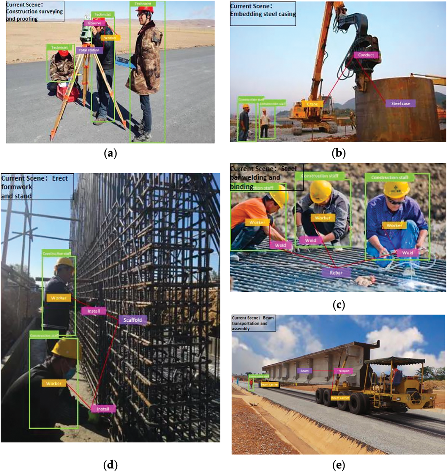 AI can also interpret construction progress from visual data. Wang et al.38 introduced a visual relationship-based method to identify key construction scenes on highway bridges from site photos and videos. Their approach uses object detection (via CNN) to recognize equipment, materials, and personnel, and then infers the construction activity (e.g., formwork installation, concreting) by analyzing spatial relationships between detected objects. Fig. 7 shows that the detection result for workers wearing helmets in Fig. 7a is a “technicist,” while the workers wearing yellow helmets in Fig. 7b–e are detected as “construction staff.” In particular, the method proposed in this paper can still accurately detect the type and location information of the relatively small-sized workers appearing on the left side of Fig. 7e. By automatically pinpointing when major milestones or critical activities occur, this technique enables more objective progress tracking and quality checks (e.g., confirming that each stage’s requisite components are in place). Fan et al.35 provide a broader overview of how ML aids design and inspection of concrete bridges. They summarize resilient methods for structural design optimization and emerging applications for inspection (such as CV for crack detection and digital twin simulations), highlighting that integrating AI during construction can improve both the structural performance and the quality control processes.