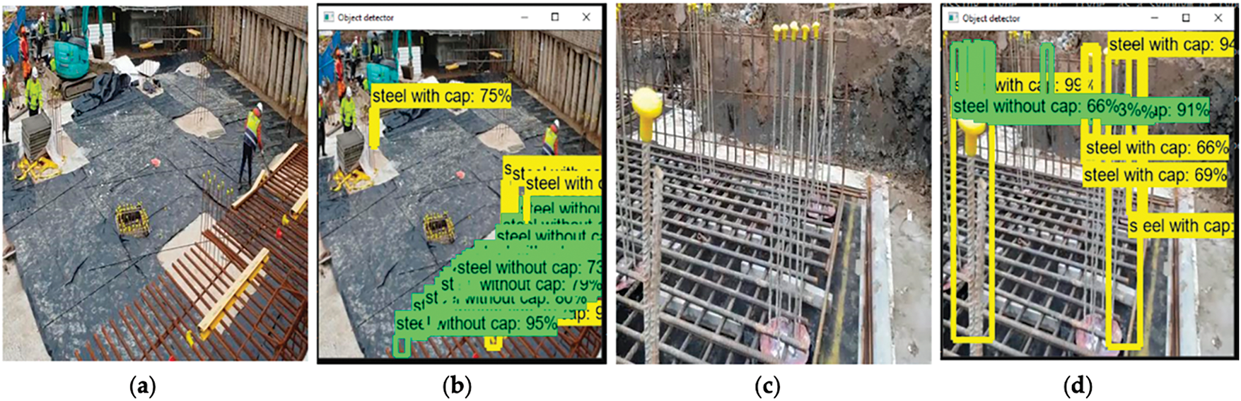 Khan et al.41 proposed a work-stage-based rule compliance monitoring framework using CV to improve safety. Their system automatically checks if safety rules such as wearing PPE, proper scaffolding setup, and restricted zones are followed at each stage of construction. It uses DL-based object detection to identify workers, equipment, and safety gear in video feeds, and then applies predefined safety rules for each construction activity. For example, during deck concreting, the AI can flag if a worker enters an exclusion zone or if someone lacks a harness at height. This real-time hazard detection allows site managers to intervene before an accident occurs. Fig. 8 shows examples of true-positive prediction for steel with cap and steel without cap. The framework effectively uses ML to serve as an ever-vigilant “safety inspector,” reducing the likelihood of human oversight errors. Wu et al.27 leveraged AI for predictive safety analytics, focusing on the risk of bridge collapses during construction. By training on historical incident data, their random-forest-based model can predict the probability of collapse or major structural failure for ongoing projects under various conditions. The model considers factors like construction stage, temporary support configuration, weather, and crew experience. A high-risk prediction can trigger an early warning, prompting additional bracing or a review of construction methodology. Such AI-driven accident prediction tools are invaluable for emergency response planning, as they enable teams to allocate emergency resources (e.g., shoring materials, evacuation routes) in advance for high-risk operations and to develop contingency plans for worst-case scenarios.