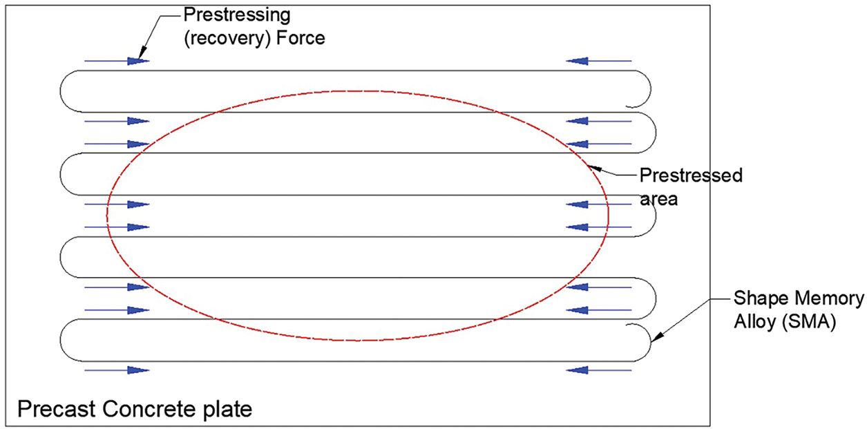 In the past three decades, shape memory alloys (SMAs) have been used to provide innovative structural engineering solutions like seismic isolators, energy-dissipating braces, dampers,9,10 prestressing elements, and in repairing and strengthening steel and concrete structures in flexure and shear.6,11–13 SMAs are metals that can return to their original shape when heated, a behavior known as the shape memory effect (SME). This occurs through a microstructural phase transformation from martensite to austenite upon heating above the austenite finish temperature (Af). If the SMA is restrained during this transformation, it generates a recovery stress, which can be harnessed to apply prestress in civil engineering applications.6,11,13 In an experimental study by Zhao and Andrawes,6 an innovative prestressing method using an SMA precast prestressing plate (SMA-PPP) was introduced. As the SMA wires were bent at the ends (see Fig. 1), they were self-anchored to the precast plate and restrained against moving or slipping. Upon heating and cooling, the SMA wires developed their recovery stress and, in turn, prestressed the mortar enclosed between the ends of the wire. Thus, the PPP developed a prestressed area in the middle, as shown by the area in the red ellipse in Fig. 1. This is the mechanism by which the concrete plate is prestressed using SMA. When voids were introduced in the plate, there was a notable reduction in the self-weight of the repair mechanism, thereby inducing higher stress in the plate and repaired member for the same prestressing force. There was also a decrease in the tensile demand on the adhesive layer due to the reduced plate weight. When the SMA bars were placed in the voids, it allowed for faster heating and cooling of the bars compared to when they were encased in concrete.