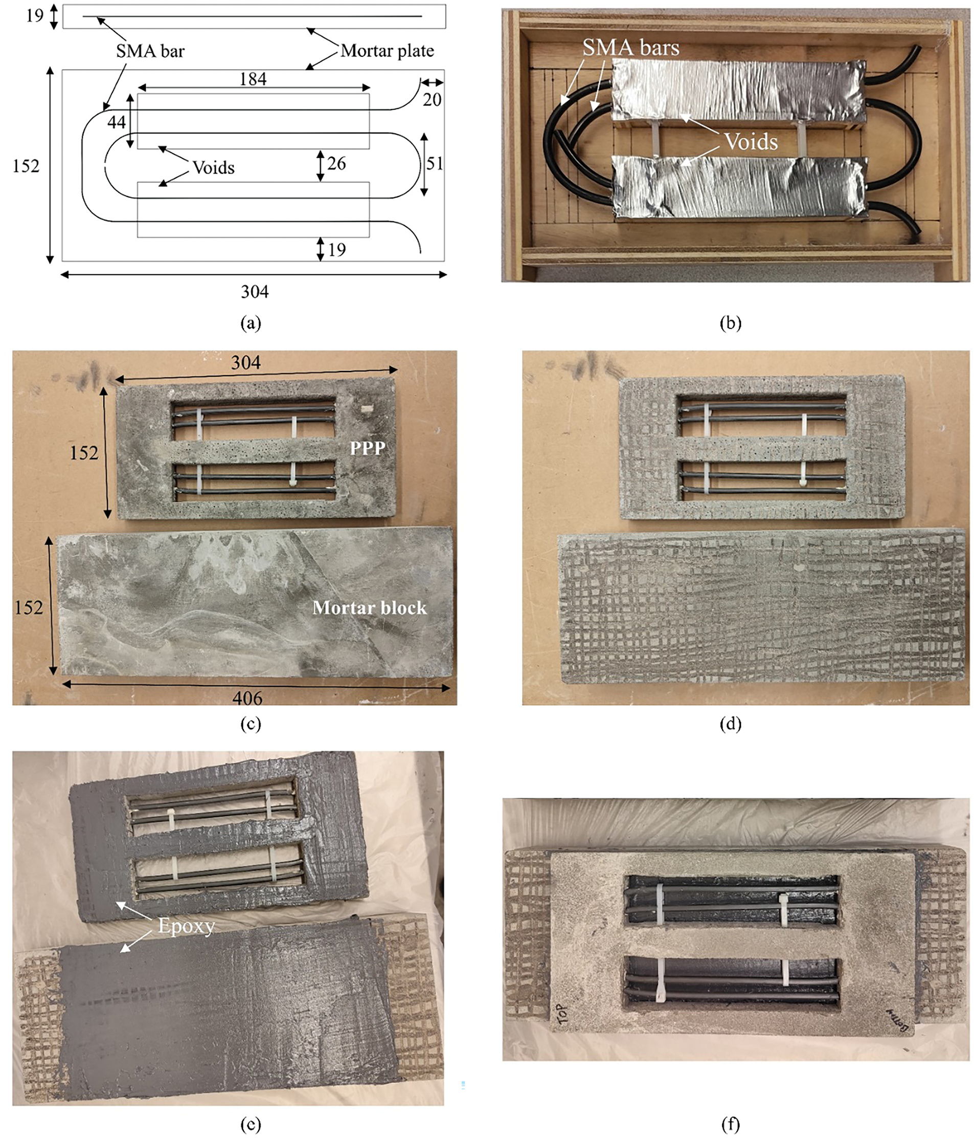 Figure 2. Details of specimen: (a) schematic of PPP (units in mm); (b) mold of PPP with SMA bars; (c) PPP and block after demolding; (d) surface preparation; (e) epoxy application; and (f) PPP attached to block