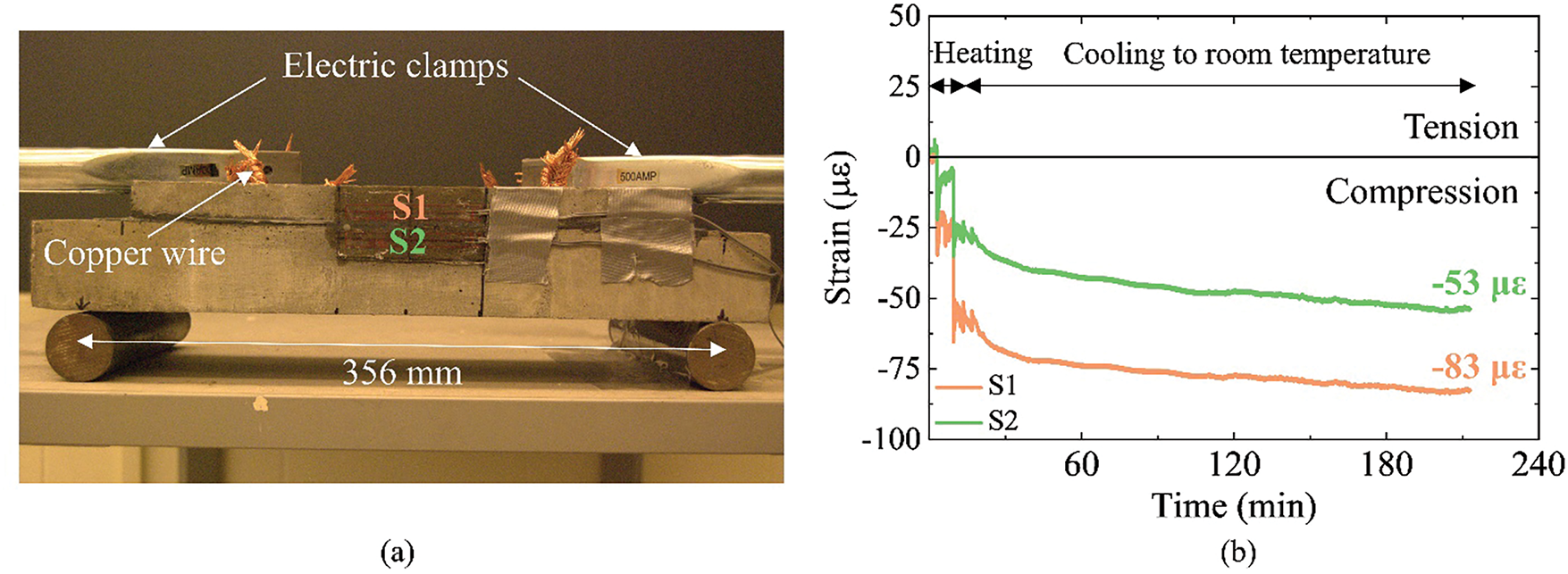 The test setup for the SMA-PPP attached to the mortar block is shown in Fig. 3a. The specimen was placed on two circular steel rods serving as vertical supports. Two strain gauges were strategically installed to monitor the strain response during the activation of the SMA bars. The first strain gauge (S1) was attached just above the bonding interface in the center of the PPP. Another strain gauge (S2) was placed right underneath the interface in the center of the block. This strain gauge setup was established to measure the transfer of prestressing force from the PPP to the block through the bonding interface. The strain measurements of both the PPP and the block were used to monitor the prestressing effect induced by the SMA activation and to assess the effectiveness of the bond between the two components.