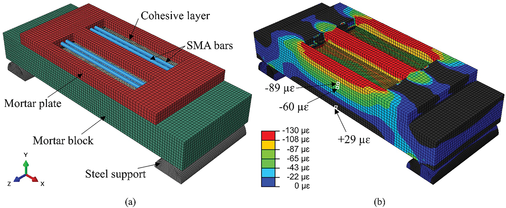 A three-dimensional (3D) numerical model of the SMA-PPP attached to the mortar block was developed using the finite element (FE) software ABAQUS18 to validate the experimental results. The assembly of the model is illustrated in Fig. 4a. The mortar plate, block, and steel supports were modeled using C3D8 elements. The SMA bar, which had the same geometry and bending configuration as the experimental specimen, was modeled using B31 beam elements. To ensure full anchorage between the SMA bars and the surrounding mortar, the embedded region feature was employed for the bent sections of the SMA bars inside the mortar plate.