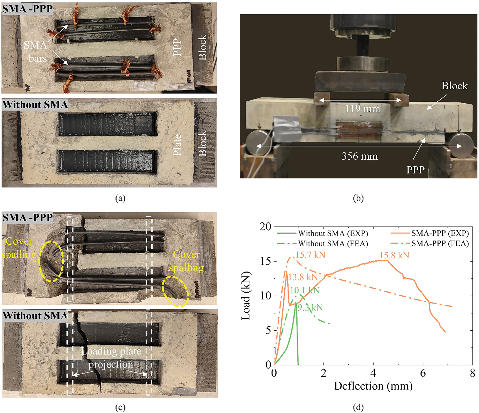 The failure modes of the two specimens were distinct and provided insight into the role of SMA reinforcement in improving the flexural capacity of the PPP. The failure progression for both specimens is illustrated in Fig. 5c. The specimen with SMA bars embedded in the PPP exhibited a ductile failure mode. The initial crack formed at the bottom of the PPP, where the tensile stresses were the highest. Then, the crack extended vertically with the increase in load. Once the crack was initiated, the SMA bars took over the load-carrying responsibility. The load was progressively transferred from the cracked concrete to the SMA bars, which provided additional capacity and delayed failure. With further loading, localized spalling of the concrete cover around the bent SMA bars was observed, but the specimen continued to sustain load without sudden failure. This behavior demonstrated the capacity of the SMA bars to carry tensile forces after cracking, contributing to the ductility of the system. The specimen exhibited visible warning signs of failure, such as spalling, the metallic sound of SMA, and large deflections, revealing its ductile behavior. On the other hand, the specimen without SMA bars failed in a brittle manner. The specimen exhibited an abrupt failure with a sudden drop in load-carrying capacity upon cracking. The initial crack also formed at the bottom of the PPP, but in the absence of SMA reinforcement, there was no mechanism to continue carrying the load after the crack formed. Consequently, the specimen failed quickly after the first crack appeared, showing minimal deformation or warning before failure.