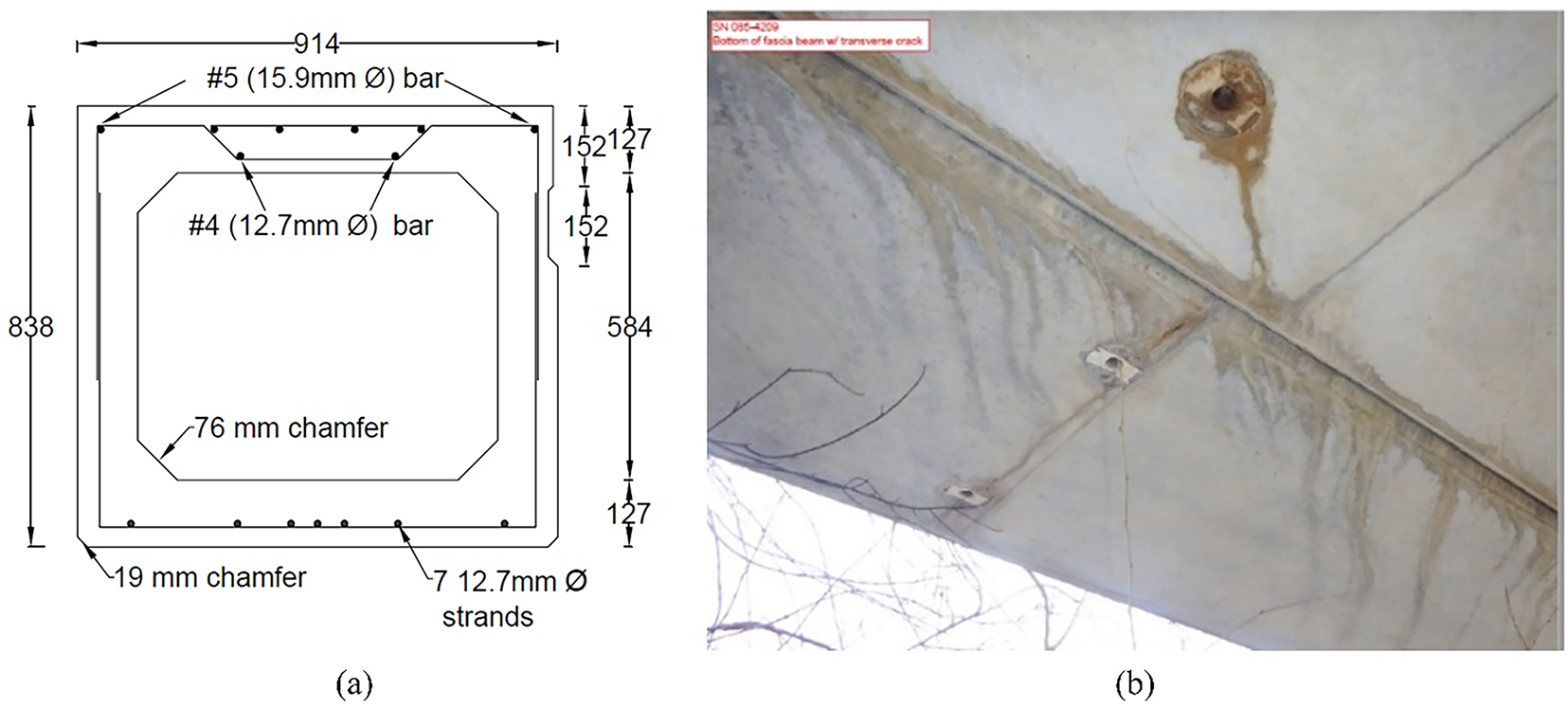 Fig. 6a shows the cross-section of the 838 mm × 914 mm PPC deck girder considered in this study. The girder was extracted from the approach span of a three-span simply supported bridge in Schuyler County, Illinois. It was constructed in 1984 according to AASHTO LFD specifications and was in service for 38 years. It was found to have a transverse crack (Fig. 6b) at the bottom of the girder, located near the mid-span, adjacent to the middle diaphragm of the girder.