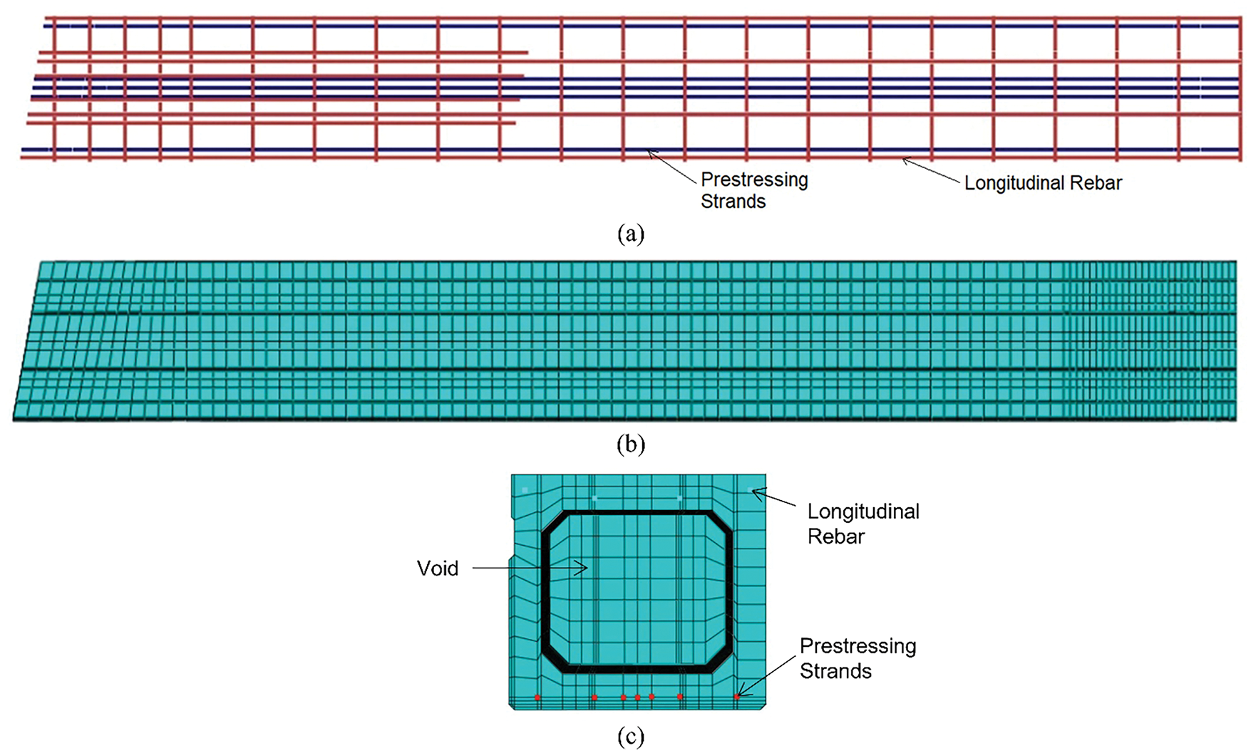 Figure 8. A rendered view illustrates the partial plan view of (a) the internal reinforcements; (b) the concrete girder; and (c) the cross-sectional view of the girder in ABAQUS