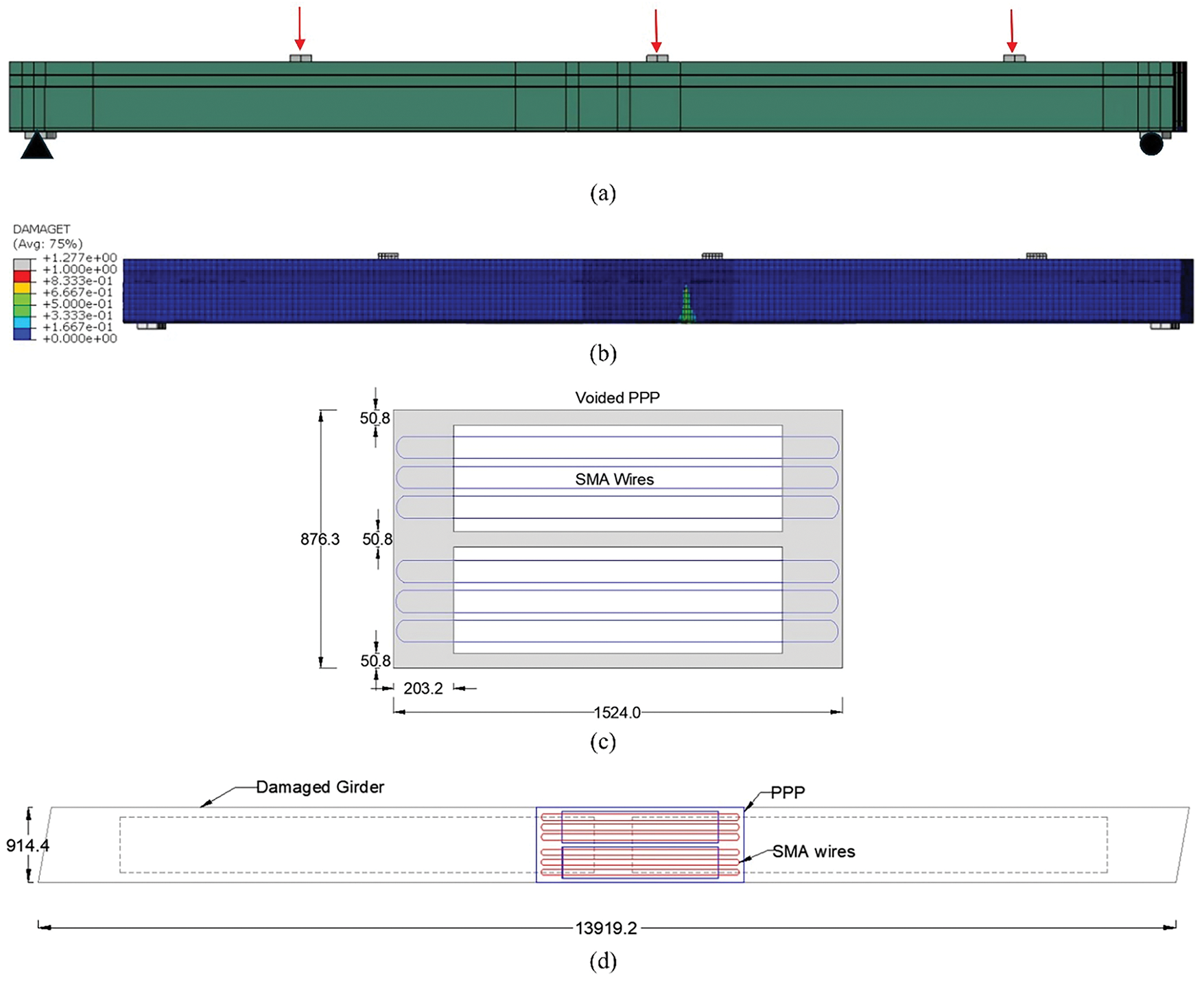 Figure 9. (a) Elevation view of the HS-20 wheel loads on the prestressed girder; (b) damage contour illustrating the transverse crack in the elevation view of the girder; (c) sketch of the plan view of a 1.52-m-long SMA-PPP; and (d) damaged girder repaired with SMA-PPP (units in mm)