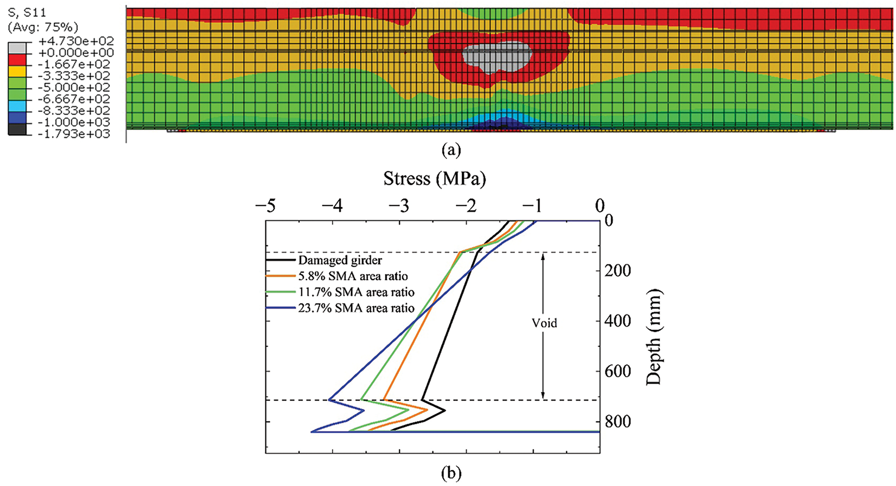 Figure 10. (a) Stress contour of the PPC deck girder repaired using a 4.57 m 23.4% SMA-PPP and (b) variation in stress distribution along the girder depth due to different SMA area ratios