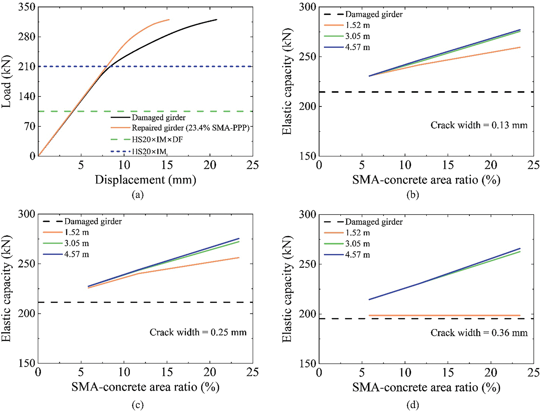 Figure 11. (a) Load–displacement curves of the damaged girder and the girder repaired with a 4.57-m-long 23.4% SMA-PPP, and the elastic capacities of damaged and repaired girders with crack widths of (b) 0.13 mm, (c) 0.25 mm, and (d) 0.36 mm