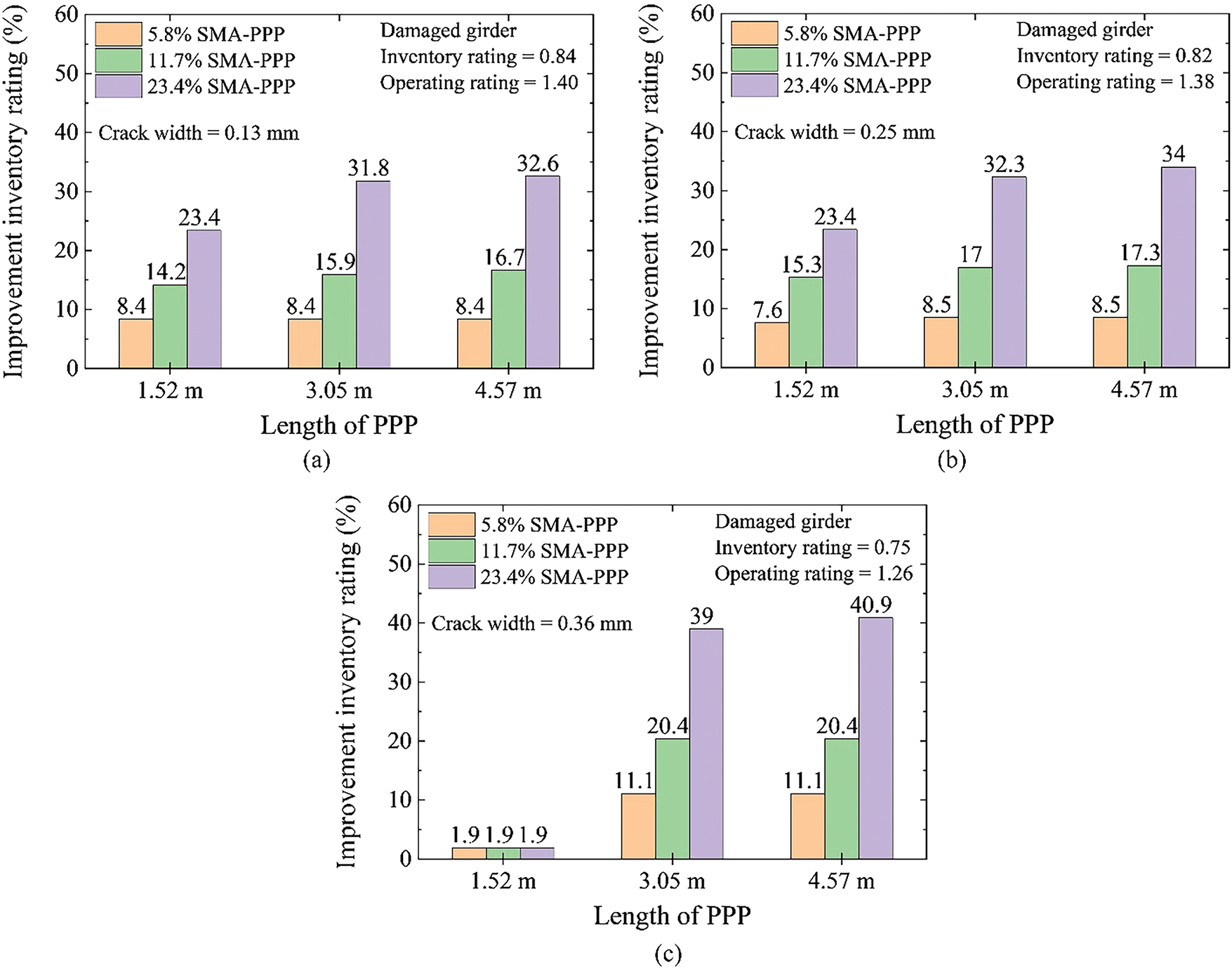 As shown in Fig. 12c, SMA-PPPs were highly effective in repairing damaged girders with a large crack width of 0.36 mm. The inventory rating of the repaired girder increased from 1.9% to 40.9% for the range of PPP lengths and SMA area ratios. The inventory rating of the girder repaired with a 1.52-m-long PPP exhibited minimal improvement as the length of the PPP was not enough to cover all the cracks in the damaged girder.