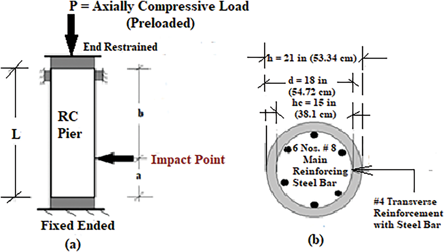 In an effort to create a more accurate and reliable model, this study develops a method that accounts for all potential energy parameters involved in short-duration impacts. This includes the assessment of the aspect ratio and its function in dissipating energy during impact events. Limit state equations (LSEs) are formulated to incorporate all relevant energy parameters, allowing for a more robust prediction of failure probabilities and the corresponding reliability of RC bridge piers with high concrete compressive strengths.8 The vehicle specifications used in the study are based on data from9 and the time of impact is treated as a nondeterministic variable to account for the inherent uncertainty in real-world scenarios. Monte Carlo (MC) simulations were employed to generate a large dataset; more than 11,000 data points for each case have been utilized to assess the reliability of the pier under varying domains of energy dissipation conditions.