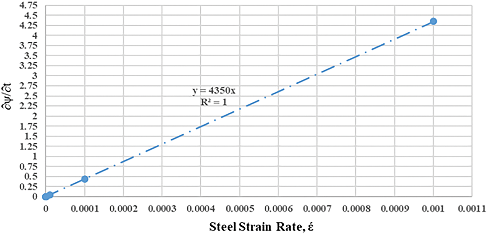 By taking the partial derivative of Eq. (5) with respect to time (t) and by inserting all values, Eq. (6) can be developed to incorporate. where reinforcing steel strain rate is represented by έ. This strain rate can therefore be evaluated as a function of the rate of formation of the plastic hinge length ratio ψ. This is represented in Fig. 2. Fig. 3 shows the comparative variations of steel strain rate with respect to plastic hinge length (Lp) and plastic hinge length ratio (ψ).