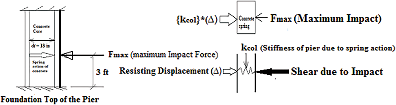 To determine the energy responsible for providing the adequate stiffness (Es) of the RC pier, the shear stiffness has been computed.23 The pier stiffness has been considered to provide resistance against the shear experienced from horizontal dynamic impact. In this research, the pier displacement concept has been adopted to account for the displacement due to rebar slip in flexural deformations.22 The energy evolved due to pier spring action (Es) is introduced in Eq. (19) and as depicted in Fig. 6.20where kcol and Δ represent pier stiffness and total deformation after recoiling.