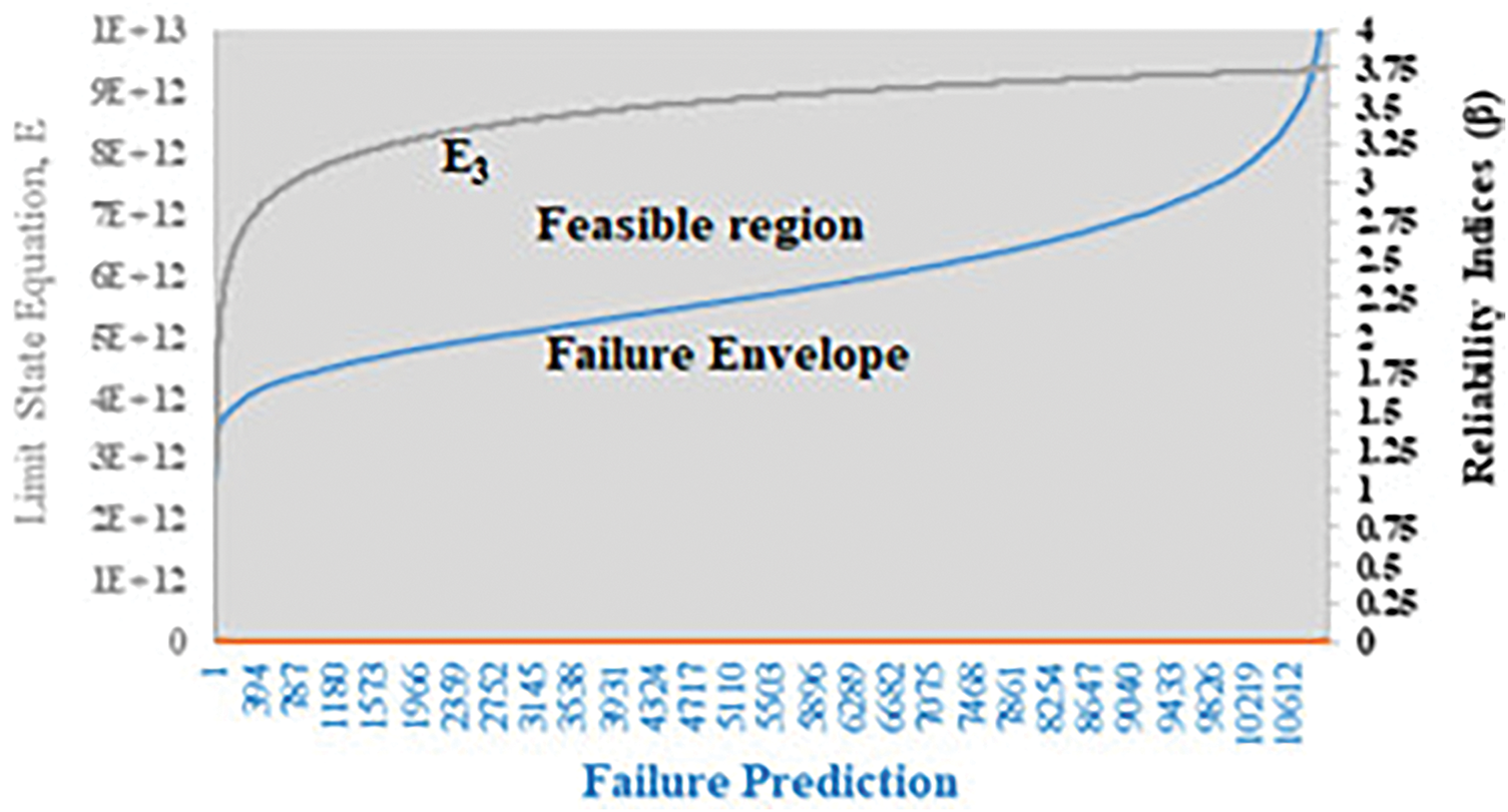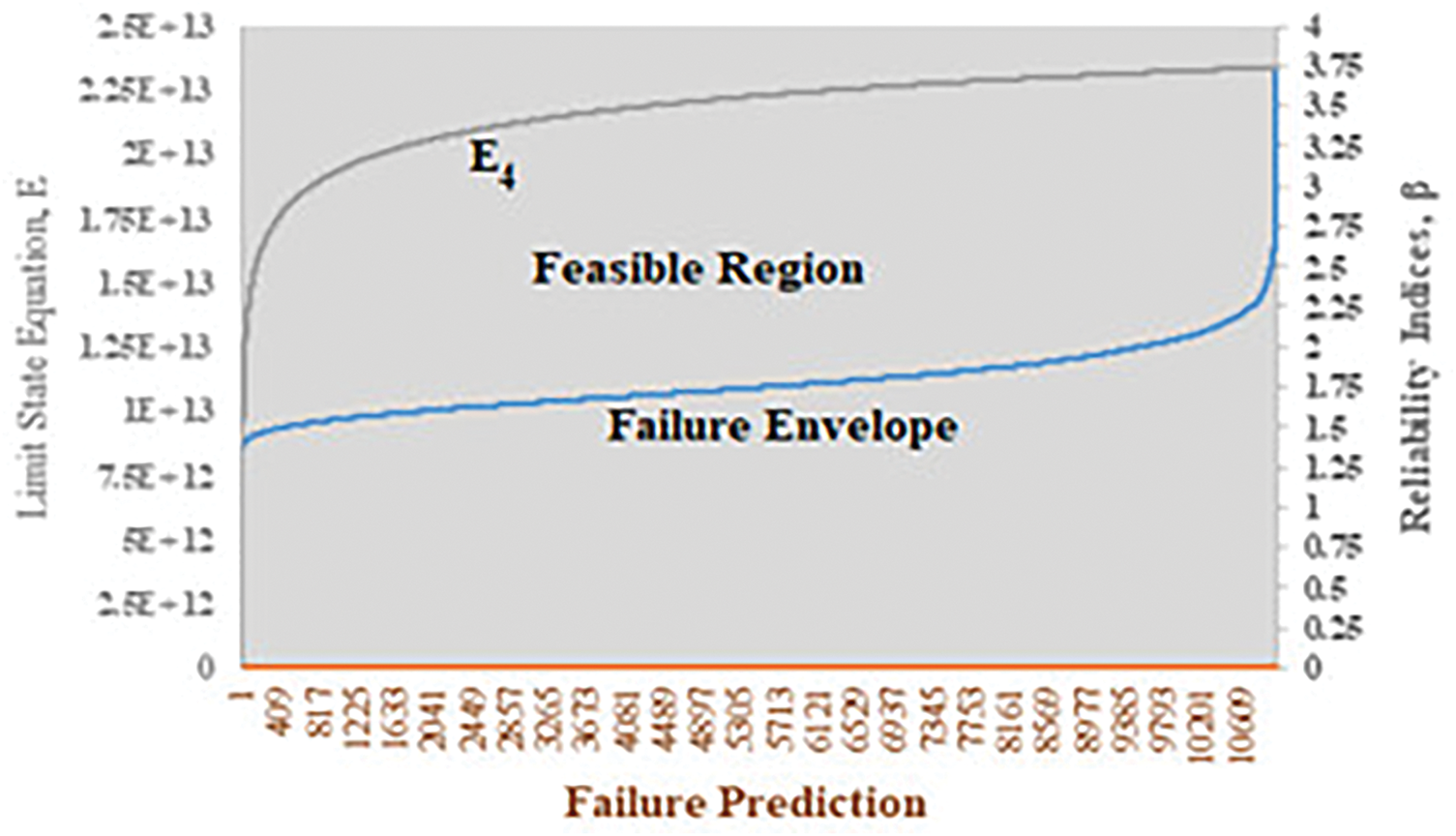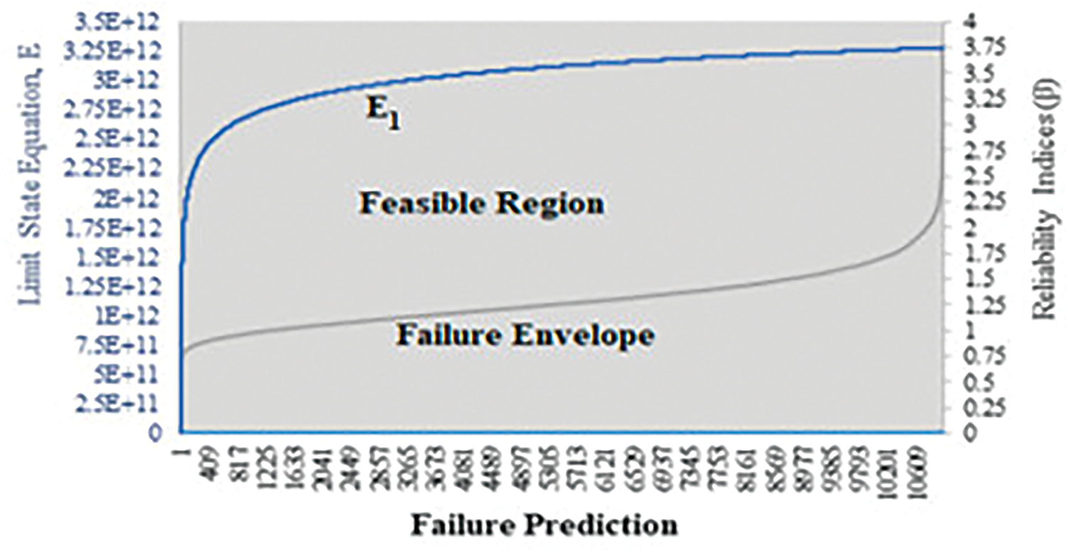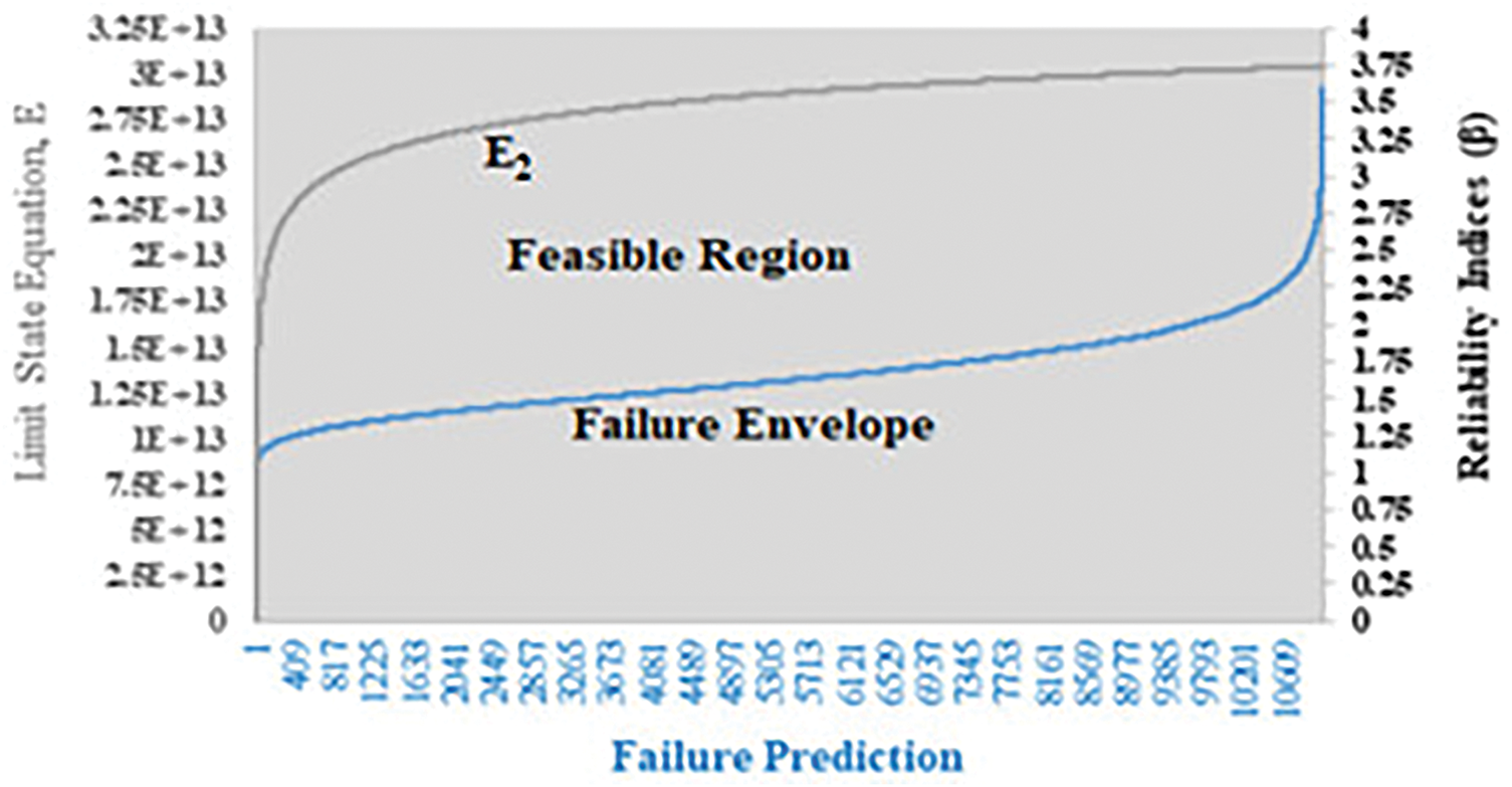 The LSE is then solved using the generated variables by using the RAND function via EXCEL. This process is repeated many times using randomly generated uniformly distributed variables. The probability of failure (Pf) is then estimated by dividing the number of times the LSE simulation is less than 0 by the total number of simulations (N) carried out. The β can be directly computed from Pf as shown in Eqs. (24) and (25).29,30 where n is the number of times the limit state has been exceeded (g(x) < 0), N is the total number of simulations undertaken, Pf is the probability of failure, β represents reliability index, and Φ−1 is the inverse of the standard normal cumulative distribution function (CDF).