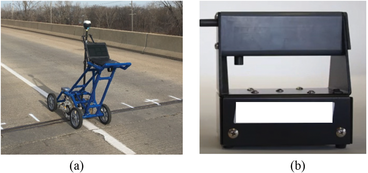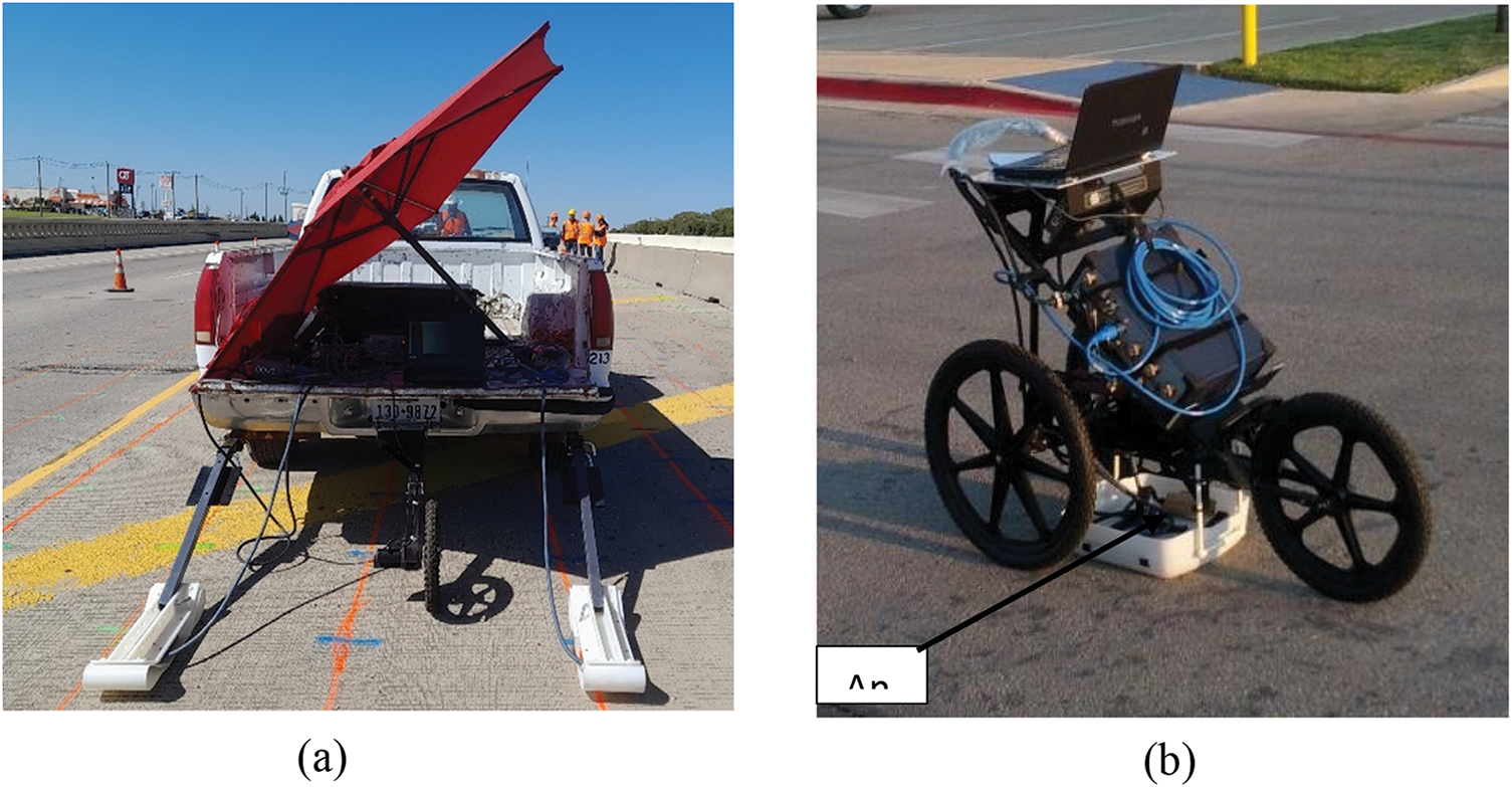 Figure 2. GPR system. (a) Truck-mounted GPR and (b) Three-wheel cart-mounted GPR