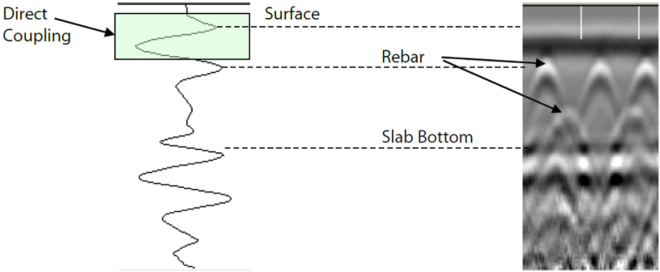 GPR transmits electromagnetic waves into concrete substrates and records the reflected signals to assess internal conditions, such as rebar cover, moisture intrusion, and material quality.5,14 The system, often mounted on a three-wheel cart or truck (Fig. 2), enables rapid scanning of bridge deck areas. Reflected signals are displayed as radargrams, which aid in identifying subsurface anomalies. Hyperbolic patterns in the radargram indicate the presence of embedded features such as rebars, while the A-scan waveform, a one-dimensional plot of signal amplitude versus time or depth at a single point, highlights amplitude changes with depth (Fig. 3).