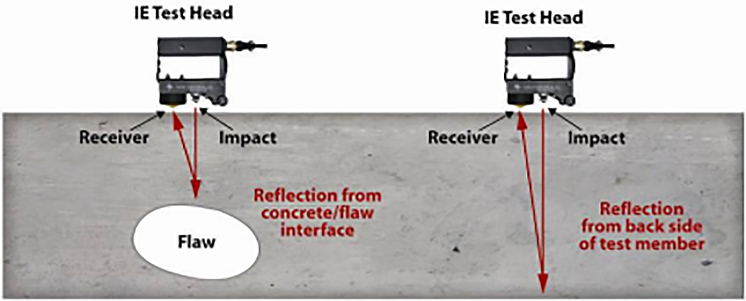 IE is a stress-wave-based technique used to detect concrete thickness and internal defects, such as delaminations, voids, and cracks, in bridge decks. The device can be a hand-held unit or a sonic surface scanner, as shown in Fig. 4. It provides a comprehensive view of subsurface conditions through analysis of frequency response.13 The method involves striking the deck surface with a mechanical impactor, generating stress waves that travel through the concrete. When these waves encounter defects, they reflect to the surface at distinct frequencies, which are then captured by a sensor (Fig. 5). Analyzing the frequency spectrum reveals the presence, depth, and extent of defects. Higher frequencies indicate shallower anomalies, while lower frequencies correspond to deeper defects. IE is particularly effective at detecting early-stage deterioration caused by rebar corrosion and freeze–thaw cycles, distinguishing between intact and deteriorated concrete.19 However, the traditional hand-held IE device can be time-consuming, as it requires point-by-point surface contact and is sensitive to surface roughness. In contrast, the sonic surface scanner–IE system enables faster, continuous deck scanning, significantly improving efficiency and minimizing traffic disruptions. La et al.20 successfully identified delaminations across multiple bridges using IE, later confirmed through coring. By integrating IE with GPR, the study provided a comprehensive assessment of both rebar-related issues and concrete integrity. Combining these methods enhances bridge condition assessment, allowing engineers to make informed decisions for maintenance and rehabilitation.