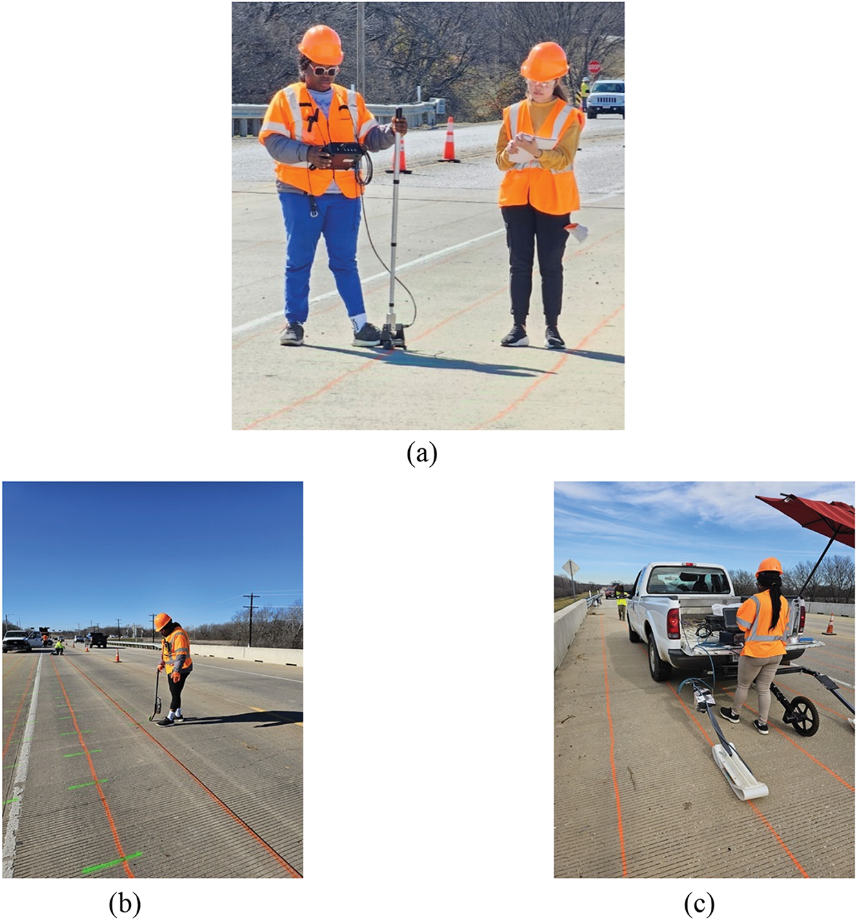 Figure 7. NDE scanning. (a) IE scanning, (b) GPR scanning gridlines, and (c) GPR deck scanning