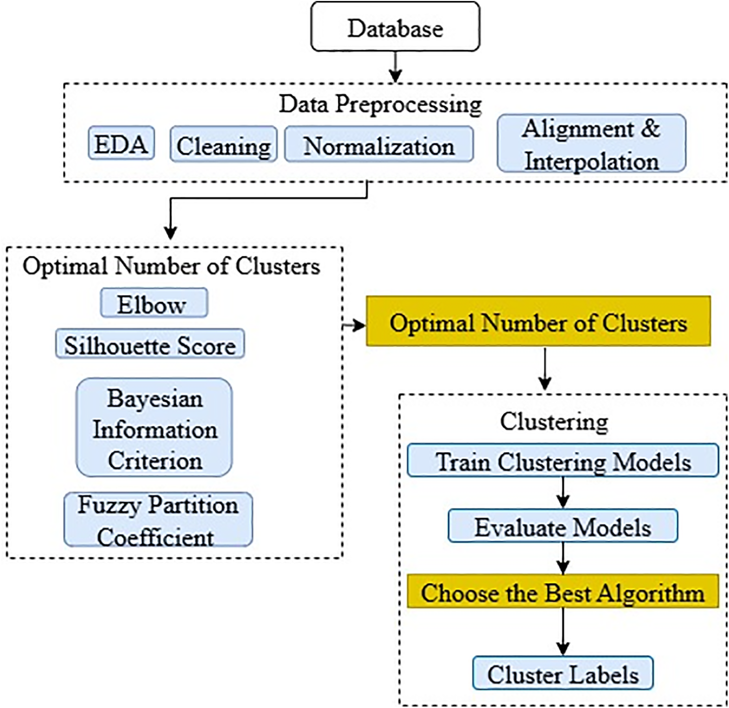 The overall clustering workflow used in this study is summarized in Fig. 8. It begins with database preparation and data preprocessing, which includes exploratory data analysis (EDA), data cleaning, and normalization. EDA was performed to identify outliers and understand the distribution of features such as two-way travel time (TWTT), amplitude, and frequency. Normalization was applied to scale the features between 0 and 1.