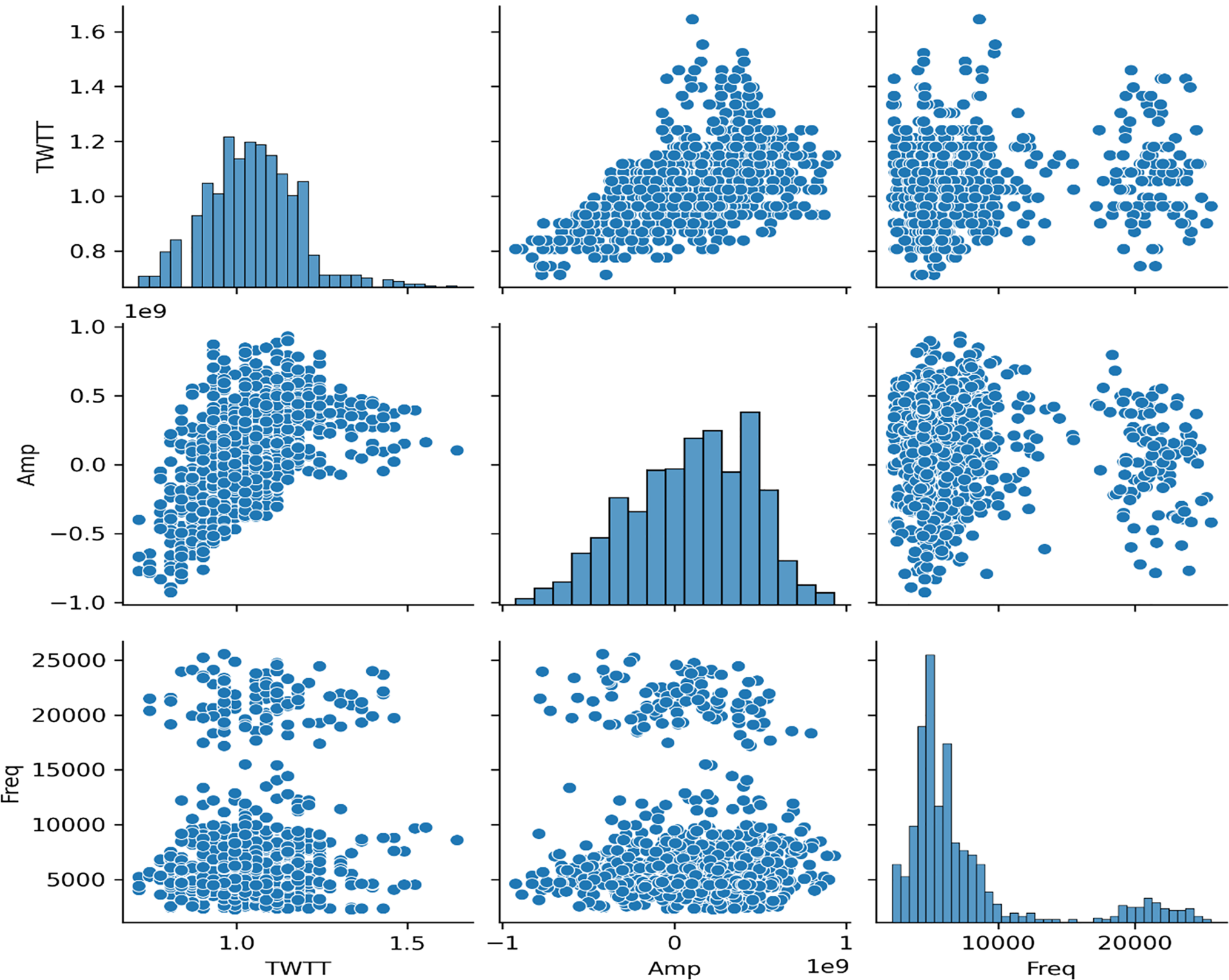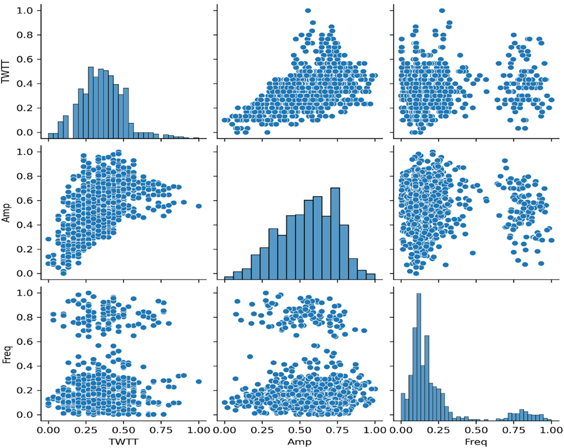 The collected GPR and IE data were preprocessed to ensure accuracy, consistency, and reliability. The first step involved data visualization to understand distribution patterns and detect anomalies. Noise and outliers were removed to enhance data quality. Feature normalization was applied, using Eq. (1), to ensure that TWTT, amplitude, and IE frequency values were within a standardized range of 0 to 1.36 Histograms and scatter plots were generated to examine the raw feature distributions prior to normalization (Fig. 9). The result of the normalization process is shown in Fig. 10, illustrating consistent feature scaling suitable for subsequent analysis