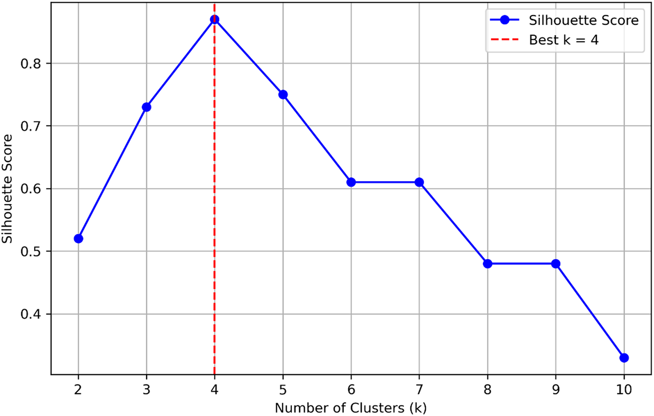 The Elbow Method involves plotting the within-cluster sum of squares for the selected features (TWTT, amplitude, and IE frequency) against different values of “k.” The point where the curve begins to flatten, referred to as the “elbow,” indicates an optimal trade-off between compactness and model complexity. As shown in Fig. 11, the elbow occurs at k = 4, suggesting that four clusters provide an efficient representation of the dataset without overfitting. The Silhouette Score measures how well each data point fits within its assigned cluster relative to other clusters. A higher silhouette score indicates better cohesion within clusters and greater separation between clusters. As shown in Fig. 12, the average silhouette score reaches its maximum value at k = 4, further supporting this choice.