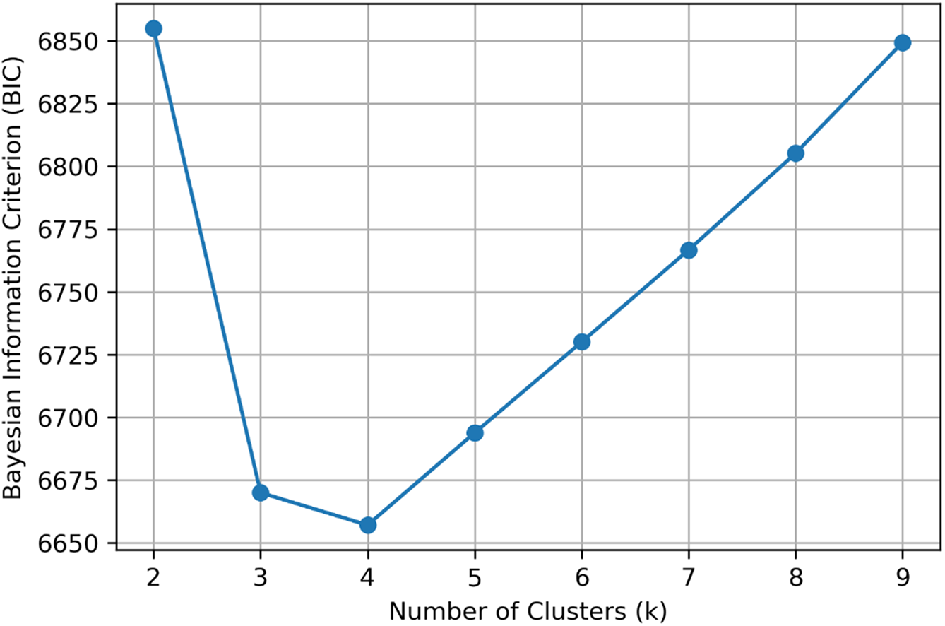 Following preprocessing, cluster validation techniques were applied to determine the optimal number of clusters. The Elbow Method was used to identify the point of diminishing returns in within-cluster variance, providing a visual guide for selecting an efficient number of clusters. The Silhouette Score quantified how well-separated the clusters were, ensuring good cohesion and separation. The Bayesian information criterion (BIC) was used specifically for the GMM to strike a balance between model fit and complexity. For FCM clustering, the fuzzy partition coefficient (FPC) was employed to evaluate the clarity of the fuzzy cluster assignments. These methods were selected because they are widely accepted for evaluating the quality of clustering across both hard and soft clustering models.29,34,35