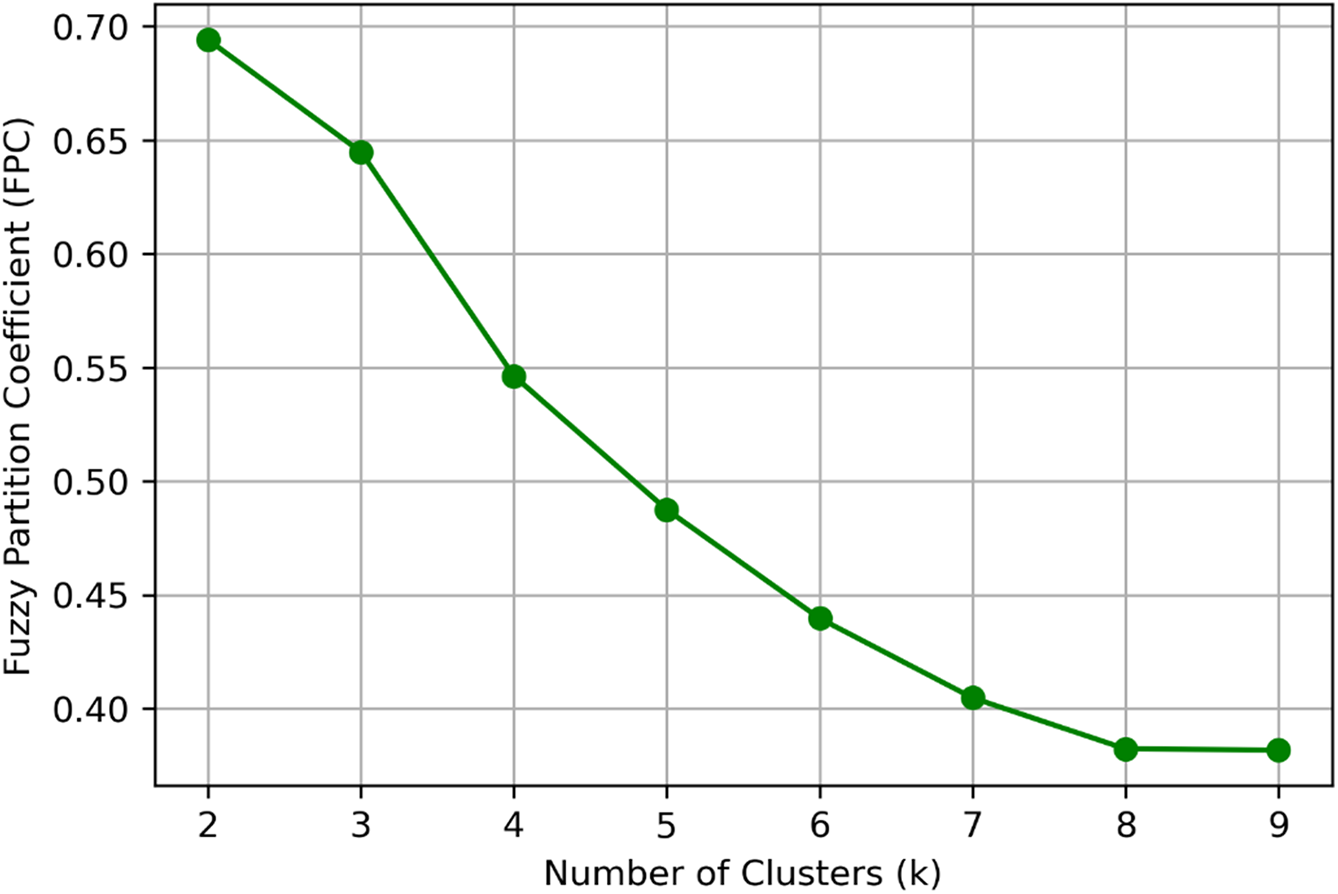 For the GMM, BIC was used to evaluate model fitness while removing excessive complexity. The lowest BIC value was observed at k = 4 (Fig. 13), indicating that this configuration achieved the best balance between data fit and parameter count. In the case of FCM, FPC was used to evaluate the clarity of the clustering structure. As expected, the FPC decreased as “k” increased, with the highest value observed at k = 2 (Fig. 14). However, the Elbow Method, Silhouette Score, and BIC consistently identified k = 4 as optimal. Thus, this value was used to configure the clustering algorithms in the subsequent analysis.