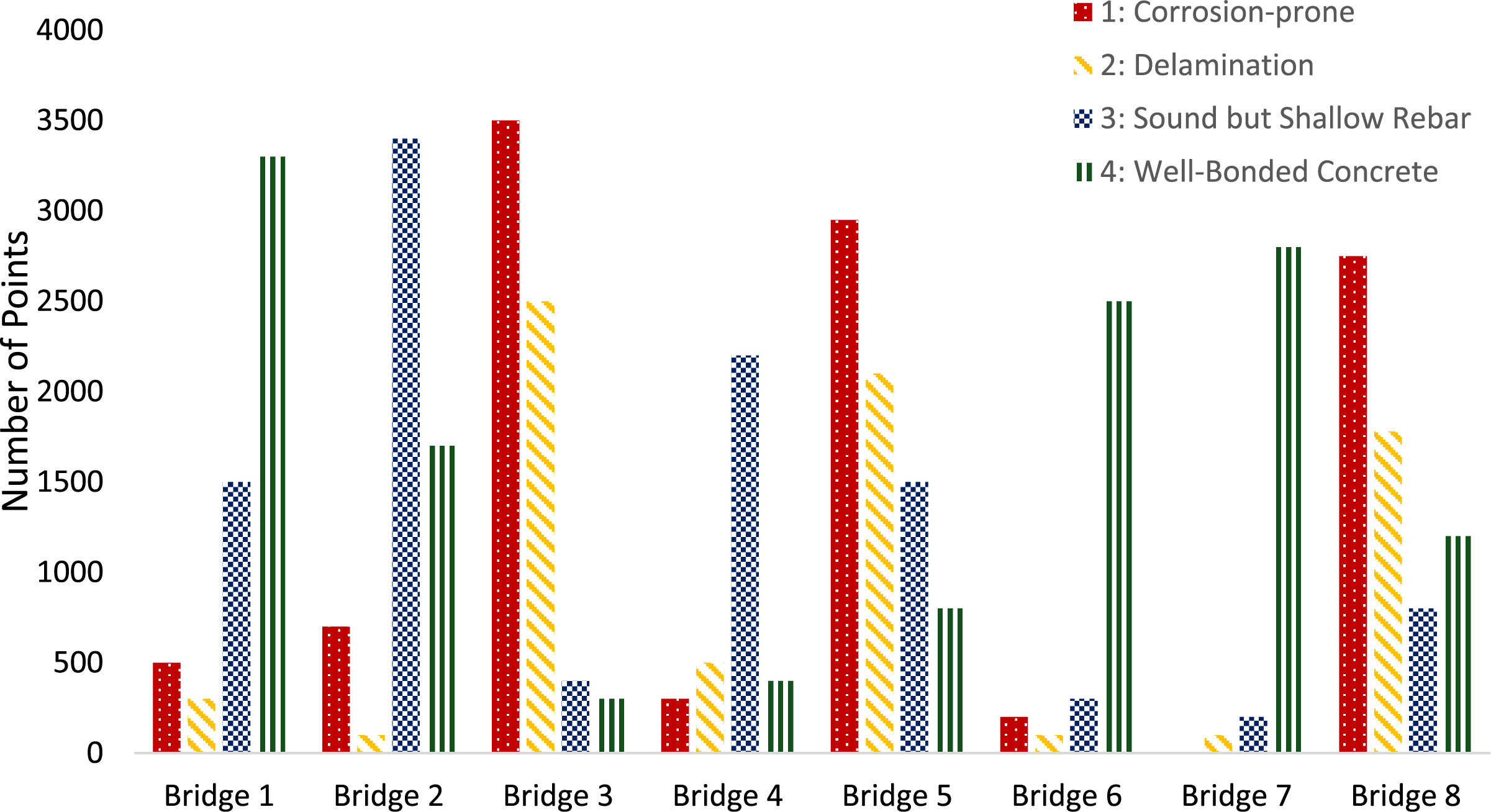 These interpretations link the cluster outputs to potential defect zones, rebar issues, or other conditions that may compromise the integrity of the bridges. These findings are summarized in Table 3, which groups the clusters based on their associated conditions.