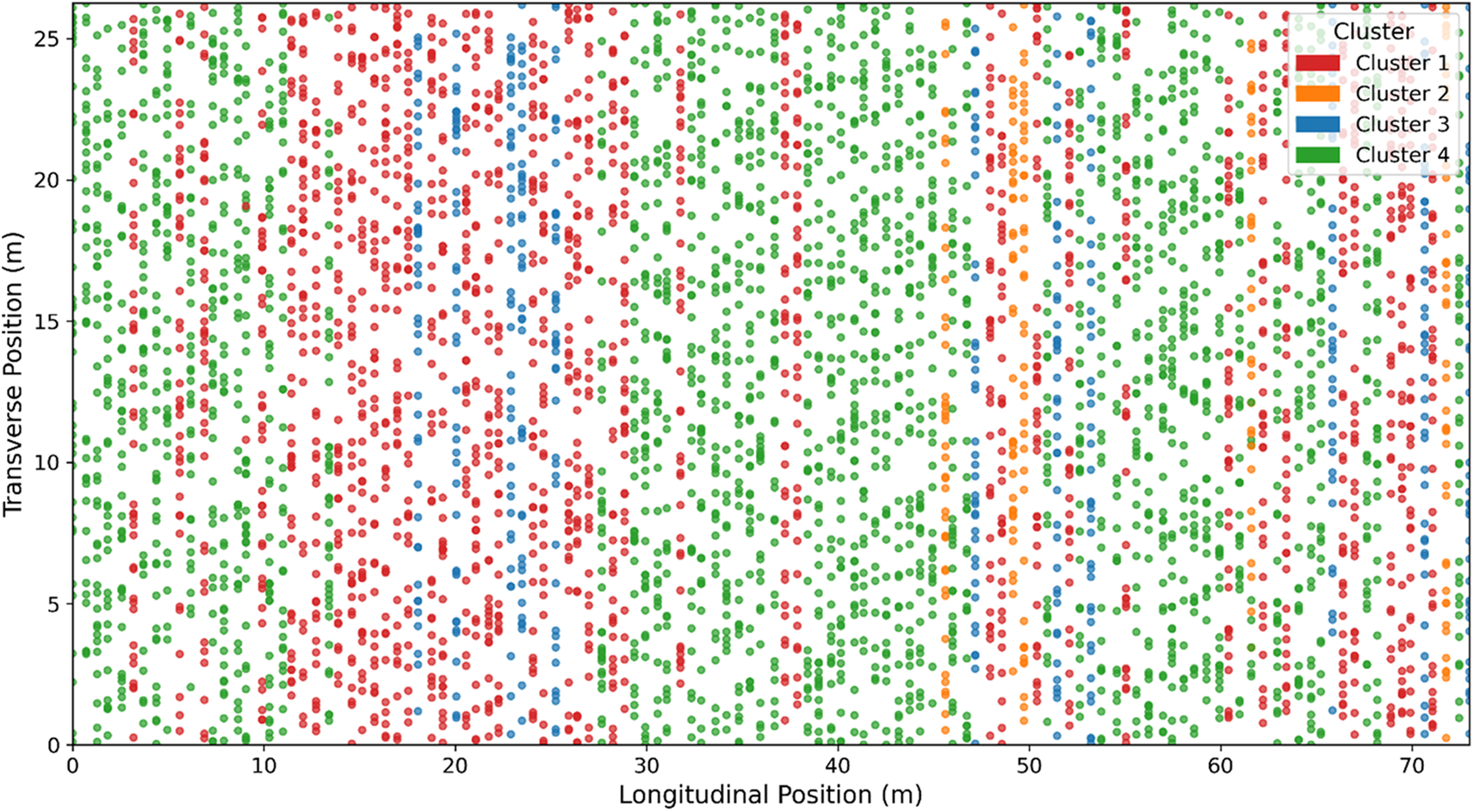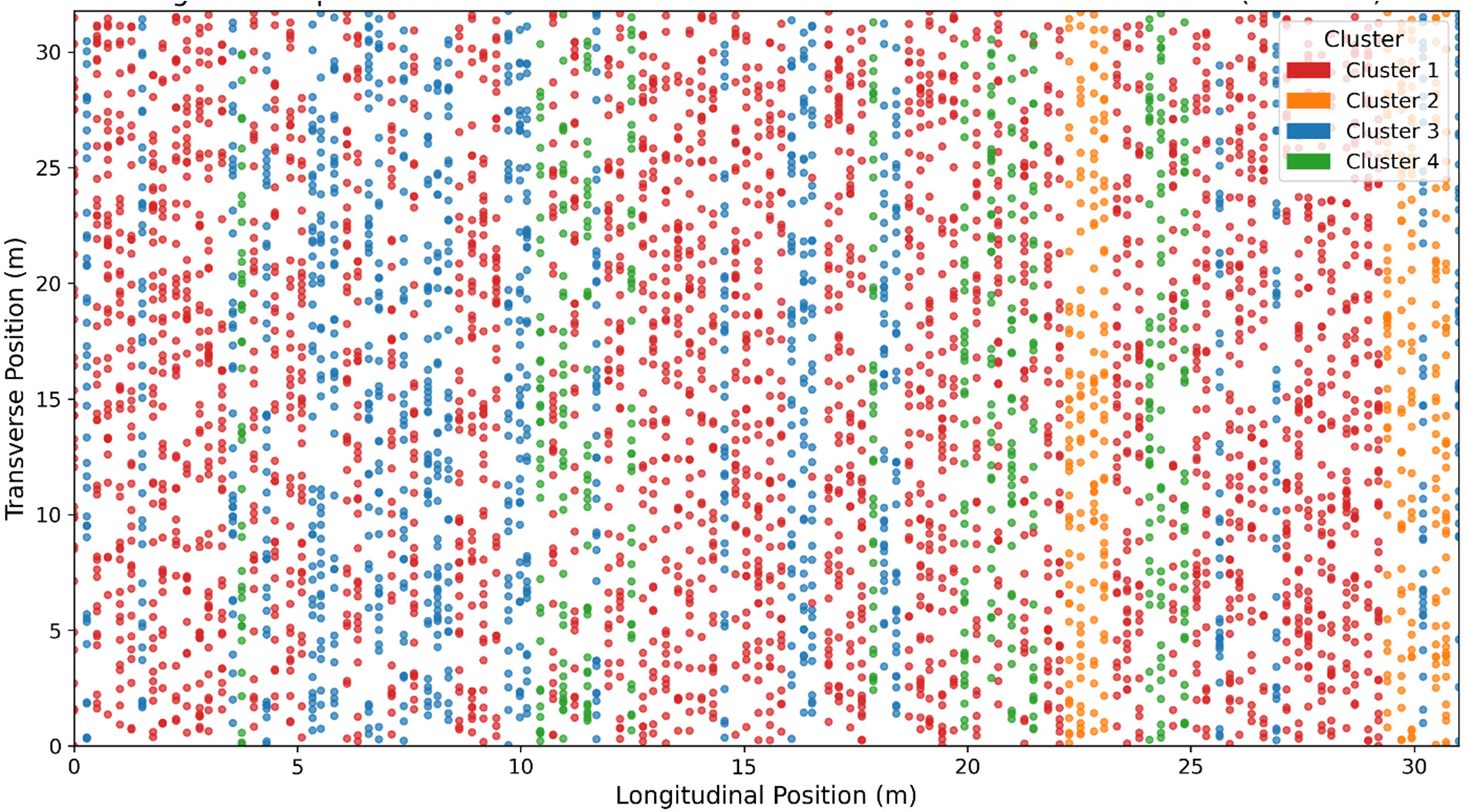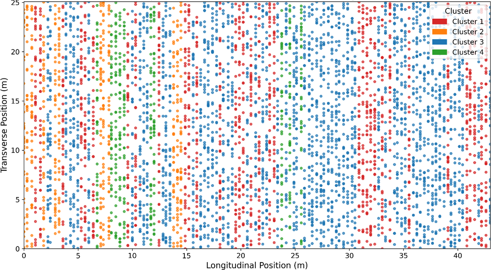 Figs. 16–18 illustrate the spatial distribution of clusters across the deck surfaces of Bridges 1, 2, and 3. These maps help engineers identify localized damage zones. Thus, instead of adopting similar maintenance strategies across the entire bridge deck, more attention may be given to areas most likely to exhibit damage and plan targeted maintenance, thereby improving efficiency and reducing costs.