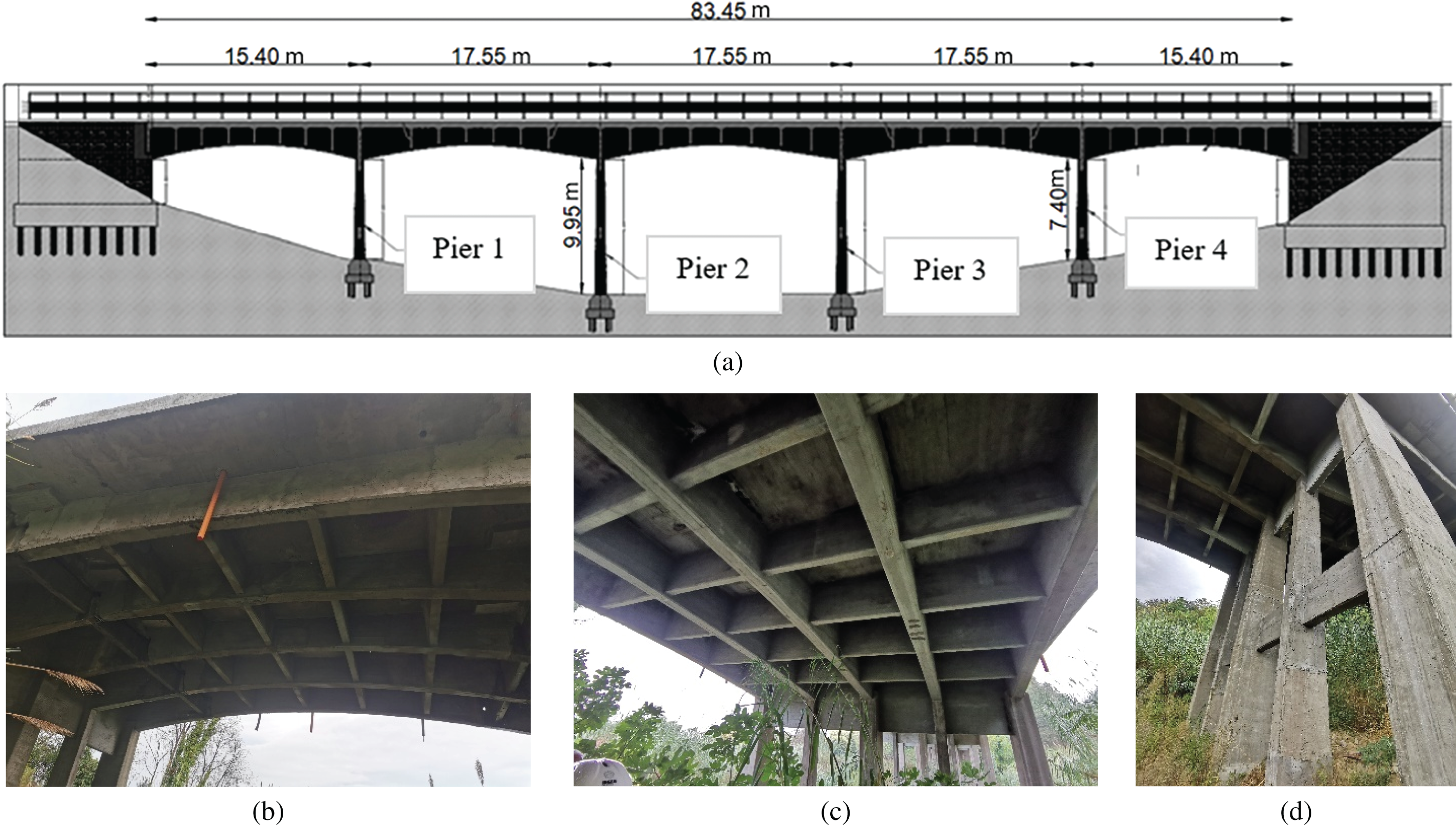 The bridge, shown in Fig. 1a, was constructed between 1961 and 1980, likely following a design predating 1960 and therefore lacking any reference to seismic standards for constructions. The deck has a total length of 84 meters, divided into five spans: two end spans of 15.40 meters each and three intermediate spans of 17.55 meters. The entire structure is made of ordinary reinforced concrete.