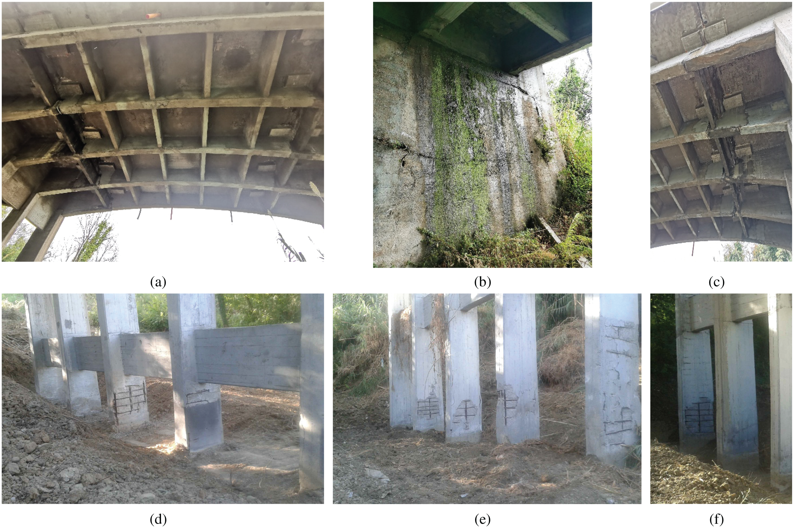 Figure 2. Observed degradation: (a) bridge deck; (b) abutment; (c) Gerber saddle; (d) pier 4; (e) pier 2; and (f) pier 3