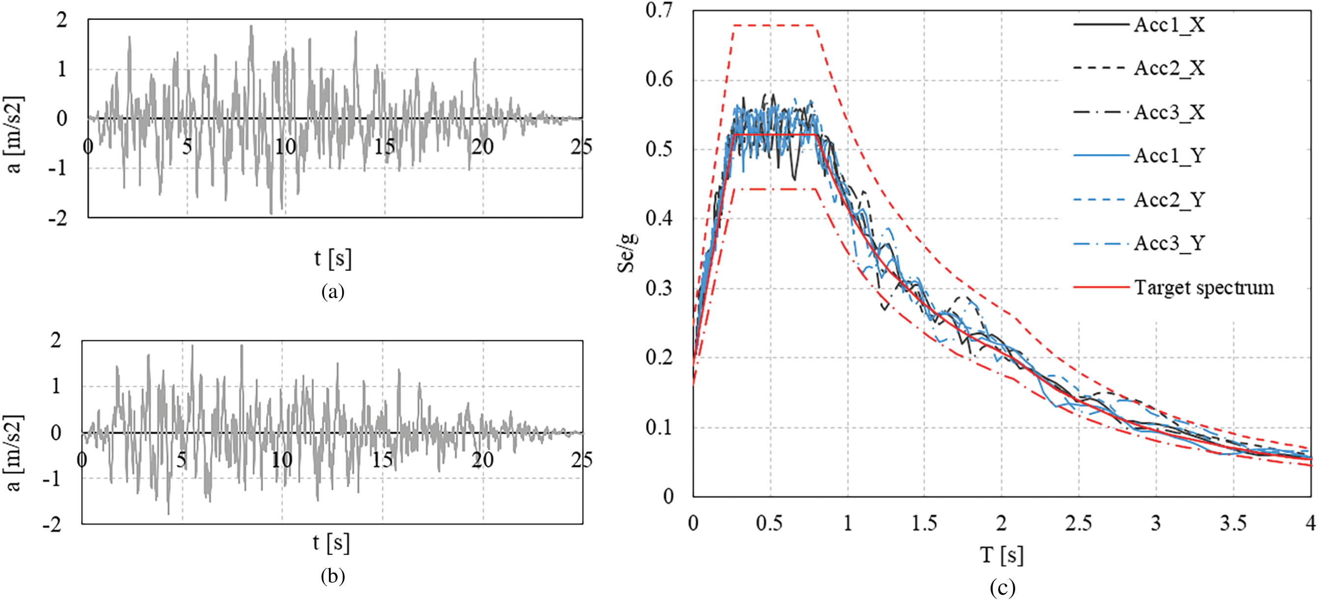 Figure 4. Nonlinear dynamic analysis input: (a) x-direction accelerogram, set 1, (b) y-direction accelerogram, set 1, and (c) spectrum compatibility verification