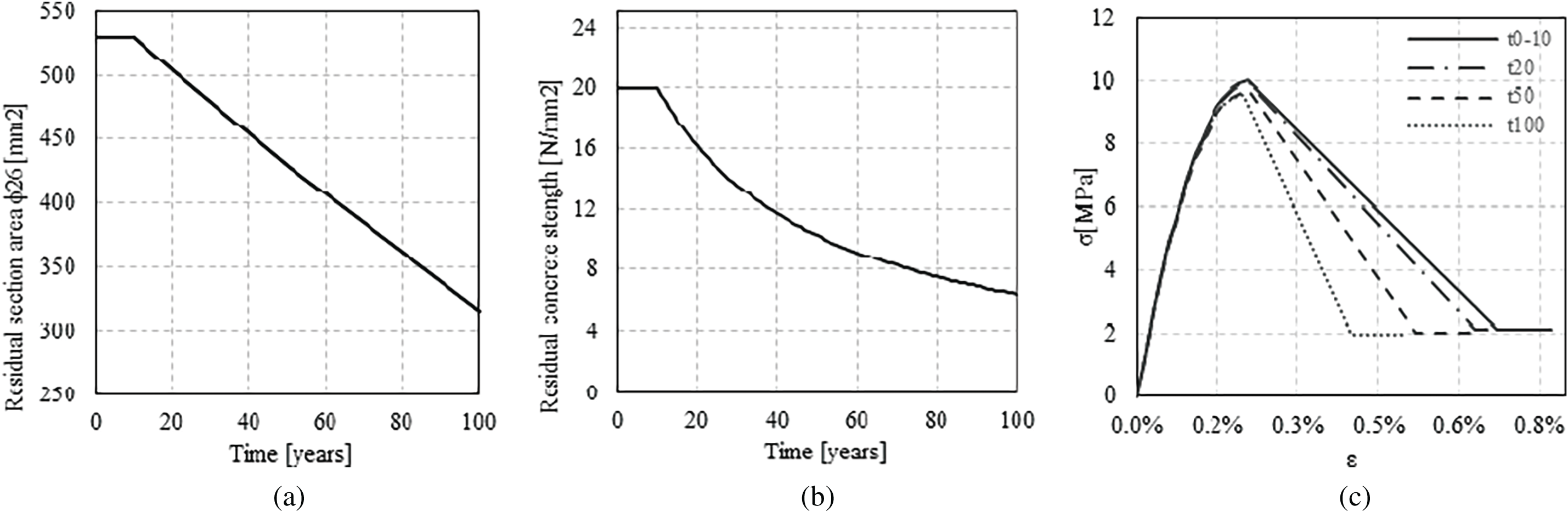 Figure 5. Time evolution: (a) reinforcement cross-sectional area; (b) concrete compressive strength; (c) Park et al.71 model, variation of the constitutive law as the degradation of the stirrups increases
