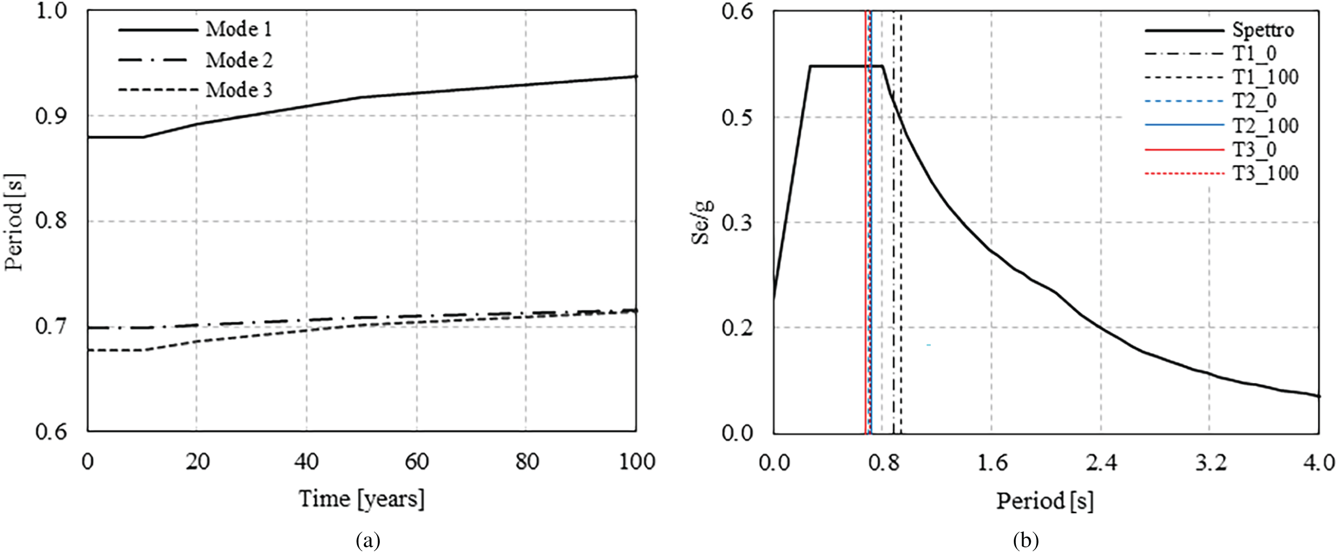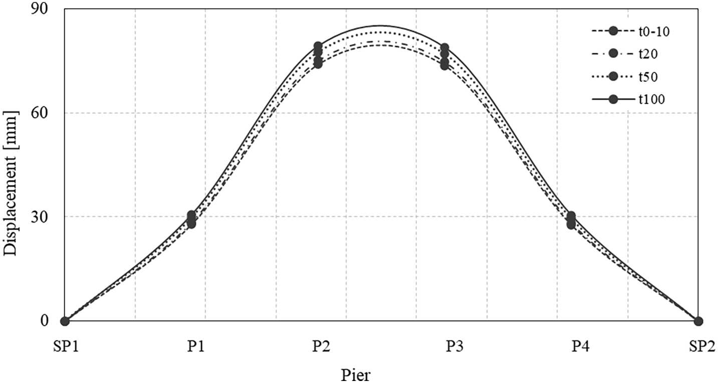 The analyses presented in the following sections consider both the initial, undegraded configuration of the structure and several degraded conditions corresponding to 10, 20, 50, and 100 years of service. At each time step, the model is updated to present the residual cross-section of the reinforcement as well as the reduced strength of steel and concrete. This timeframe allows for an evaluation of the structural response over time, encompassing both the current age of the bridge under study, now exceeding 50 years, and the typical design service life of such structures, generally assumed to be 100 years. Tables 4 reports the evolution of the mechanical and geometrical parameters affected by corrosion, for steel and concrete respectively.