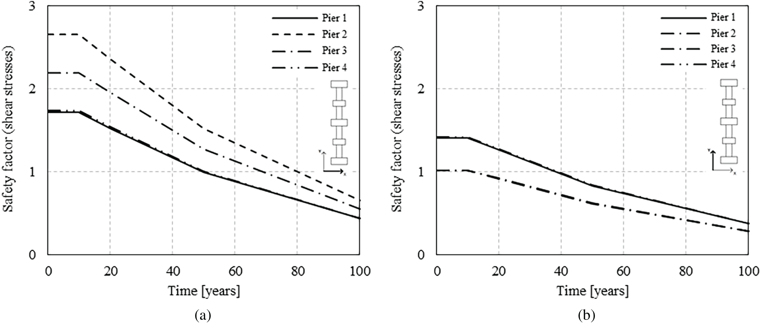 The results indicate that the bridge is structurally inadequate. Moreover, the strengthening intervention applied to the piers proved counterproductive, as it caused a redistribution of the loads with an increase of demand for the jacketed shafts. As degradation advances, there is a clear decline in the ability to withstand applied loads. In the absence of repair interventions, the safety factor continues to decrease over time. This is accompanied by reduced ductility, increased deformability, and decreased energy dissipation capacity. These trends become critical even in the early stages of corrosion and at time intervals comparable to the current age of the bridge, underscoring the importance of incorporating time-dependent degradation effects to accurately assess structural capacity and estimate residual service life.