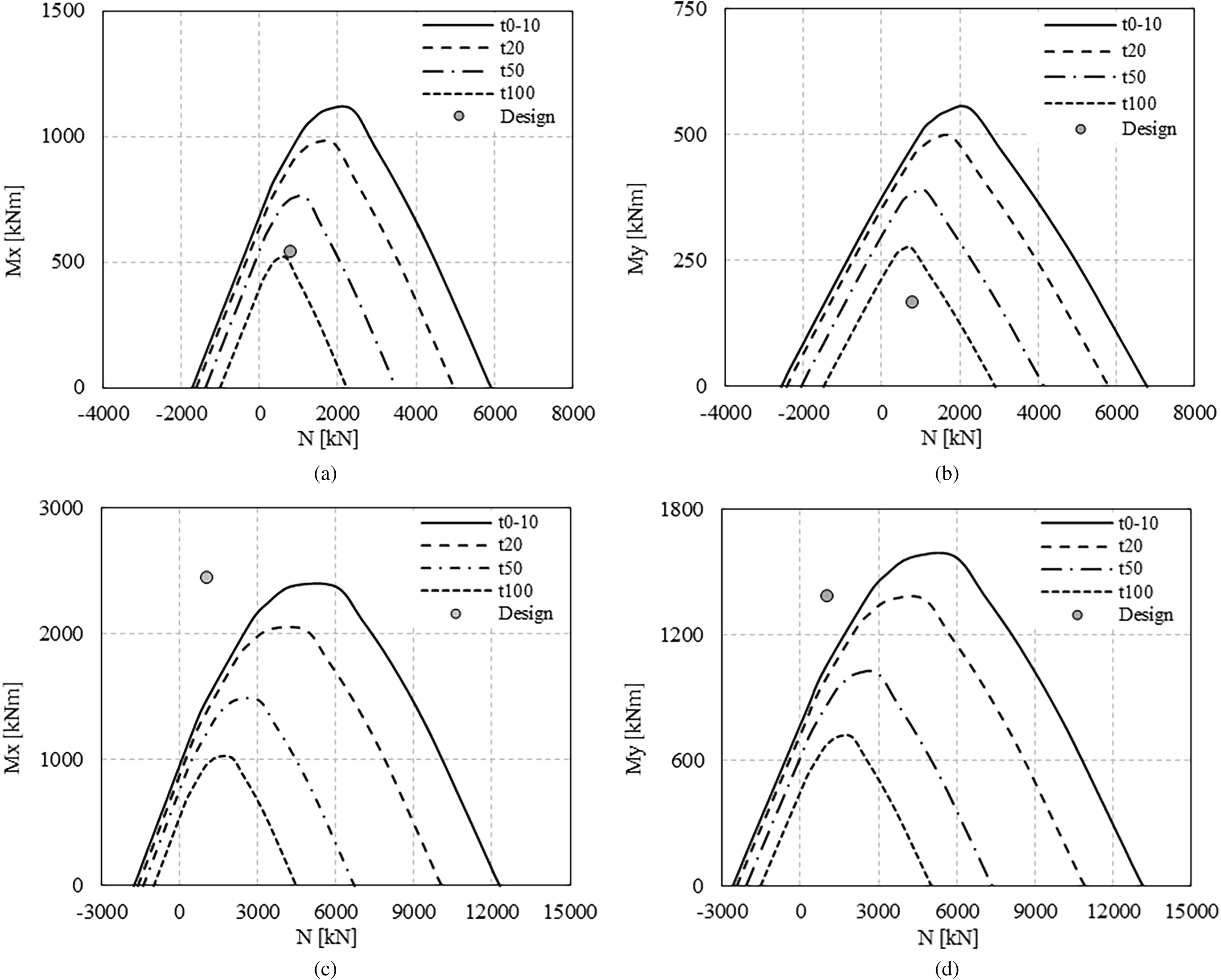 Fig. 13 shows the moment–curvature relationship for the shafts of the most heavily loaded pier at four significant time intervals (0–10, 20, 50, and 100 years), accounting for the effects of corrosion. From the numerical analysis, the moment–curvature relationship was obtained at the section level. In the nonlinear dynamic analysis, the data take on a cyclic form: at each deformation increment, hysteresis loops were generated, revealing the progressive degradation of stiffness and strength. From these loops, backbone curves were extrapolated enveloping the peak response points for each ascending branch (loading in one direction). The corresponding bilinear curves were then constructed to preserve the main characteristics of the actual response, namely, the initial stiffness, the yield moment, and the ultimate moment.