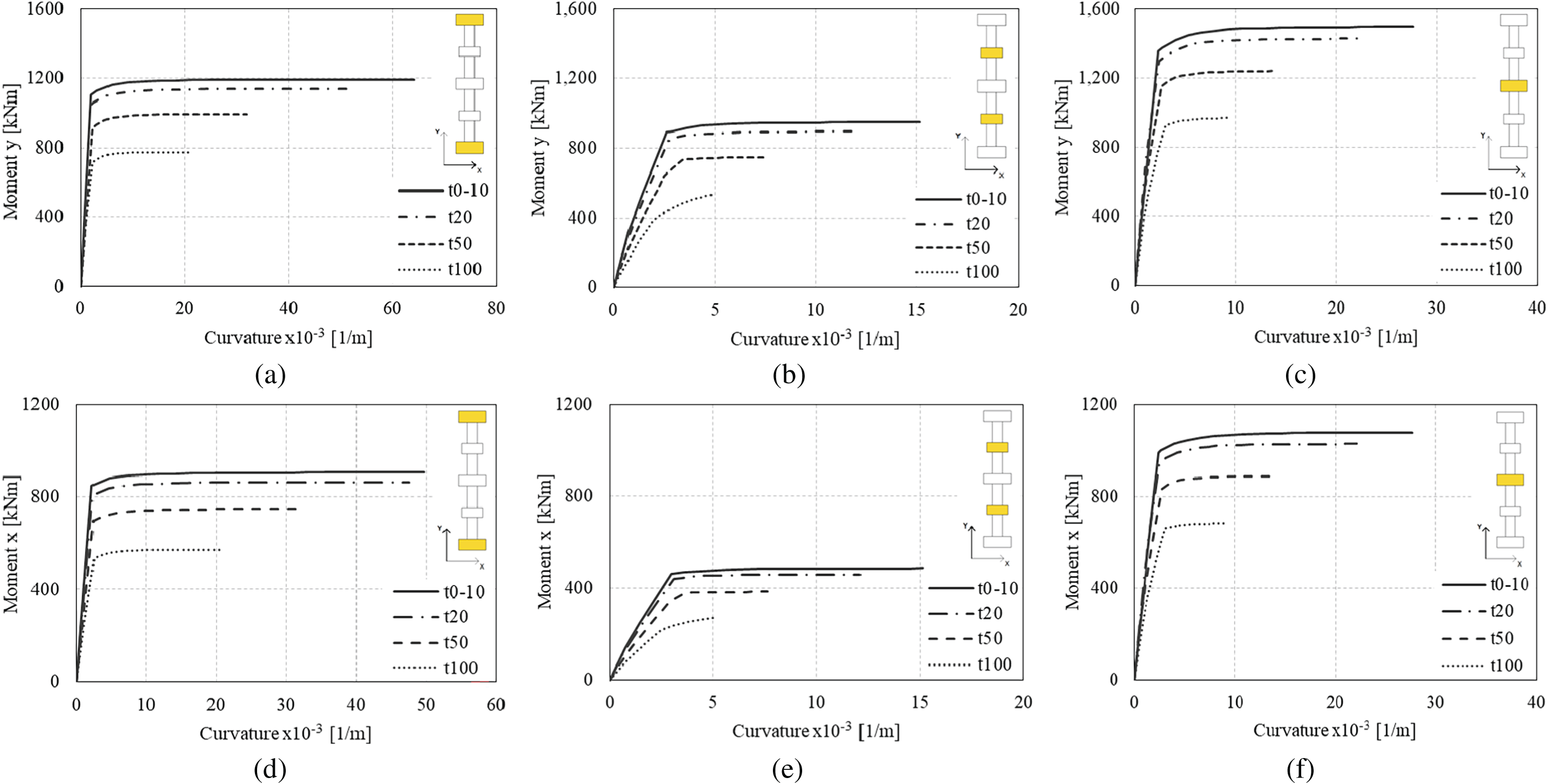 Figure 13. Variation of moment–curvature diagram over time: (a) pier shafts 1–5, y-direction; (b) pier shafts 2–4, y-direction; (c) pier shaft 3, y-direction; (d) pier shafts 1–5, x-direction; (e) pier shafts 2–4, x-direction; and (f) pier shaft 3, x-direction