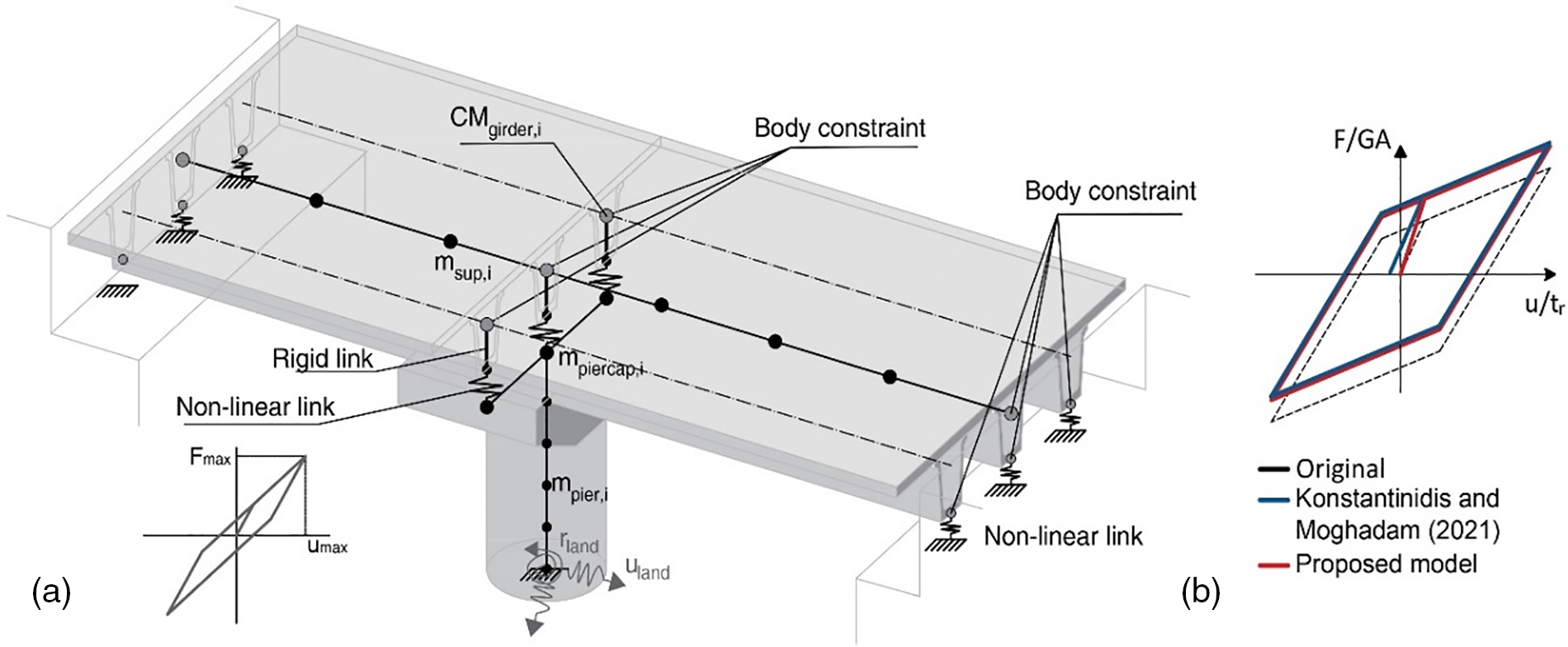 Figure 2. a) Strategy for numerical modeling; b) Proposed modification to elastomeric bearing constitutive law. F/GA represents the ratio between the horizontal force and the elastomer area and shear modulus. u/tr represents the ratio between the horizontal displacement and the rubber thickness