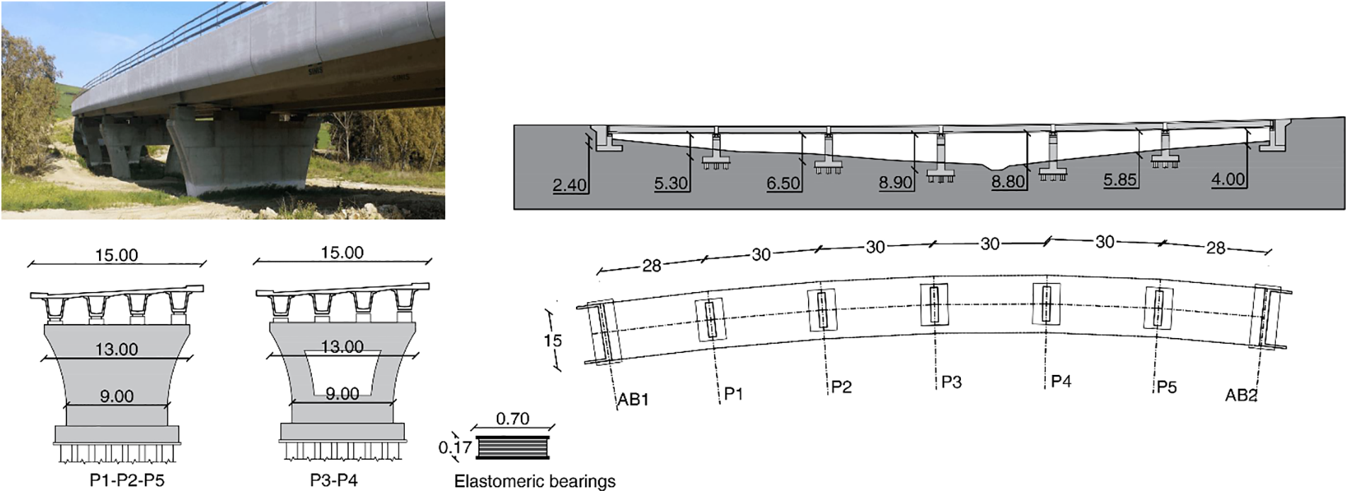 The “Santo Stefano” Viaduct is placed on the Bradanica road, which links the municipalities of Matera and Candela, between the regions Basilicata and Puglia, Southern Italy. The bridge was built in 2013 to overpass the Santo Stefano canal. It extends for about 180 m with six spans. A graphic description of the case-study bridge is reported in Fig. 4. The continuous superstructure is composed of four precast U-shaped girders with height of 1.80 m, covered by an RC slab having a thickness equal to 0.25 m. The piers are founded on large-diameter bored piles. Two abutments, consisting of RC walls, were built to support the access embankments to the viaduct. The piers present height ranging from 5.70 and 8.90 m. As shown in Fig. 4c, three wall-type piers exhibit a like-trapezoidal shape with variable cross-section dimensions along the height, while the two highest piers are characterized by framed structure. The girders are connected to the piers through a line of elastomeric bearings placed on baggies. Four bearings are placed on each pier and designed to present an equivalent viscous damping equal to about 12%. Properties assigned to elastomeric bearings are listed in Table 1. In the end, it is worth noting that the bridge presents a slight curvature along its longitudinal extension, with a radius of about 700 m. In Fig. 4, a photo of the bridge, a planimetric view and a longitudinal view are reported.