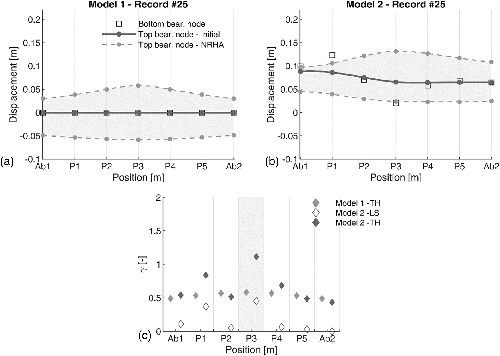 On this base, 30 runs of NRHA were performed on both numerical models. For the sake of simplicity, given the illustrative purpose of this study, only the seismic response in transverse direction was considered. For both models, a post-processing check was performed after NRHAs to avert the occurrence of nonlinear mechanisms in the structural elements (i.e., in the piers). EDP were extracted in terms of shear strain γ demand of the elastomeric bearings. To interpret the achieved results and for describing how NRHA results were elaborated to obtain bearing shear strains γ, the outcomes for a randomly selected record (in terms of displacement registered for significant nodes) are shown in Figs. 7a and 7b. The initial displacement (initial condition for NRHA) of the bearing top node is indicated as continuous dark-grey curve. Clearly, this is equal to 0 for model 1, while it reflects the initial landslide-induced deck deformed shape for model 2. The maximum displacement demand registered for bearing top nodes during NRHA (in positive and negative direction) is also presented via dashed light-grey curves. The position of the lower bearing node is additionally indicated by means of black circular markers. Note that no significant displacements of the lower bearing node (i.e., pier top node) are observed during the seismic excitations. Fig. 7c reports the shear strain demand calculated for the two models. The comparison between Figs. 7a and 7b shows the significant influence of the landslide-induced effects in the NRHA-based displacement profile. For model 1, the displacement demand for bearing devices reflects a “parabolic” distribution. This is also reflected on γ values for model 1 reported in Fig. 7c. The maximum demand was registered for the bearing device placed on the central pier (i.e., indicated as P3). Similar results were observed for the other NRHAs. For model 2, the initial displacement pattern of bearing top nodes reflects the hyperstatic response of the superstructure under landslide-induced differential pier displacements (black markers). Therefore, the bearings were subject to an initial shear strain demand before the NRHA was conducted. The displacement demand induced by NLRHA exhibited an irregular shape with respect to the former case. For each bearing device, the shear strain demand was computed considering the differential displacement between the top and the bottom nodes. As shown in Fig. 7c, this resulted in a general increase in shear strain demand with respect to model 1 for the bearing devices. Also, in this case, the highest γ was related to the central pier.